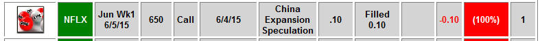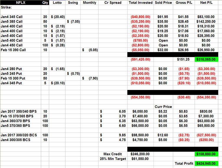 ============================================================================================================= 12/20/15 - Tough week of trading with FOMC and now the raising of the interest rates. NFLX is on the growth path and that is where money will be flowing in 2016 so I am a buyer on any dips and long strategies are what I am looking for. If we get a reversal started tomorrow, I will be jumping into long shares and selling naked puts.