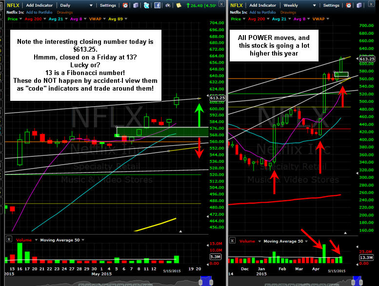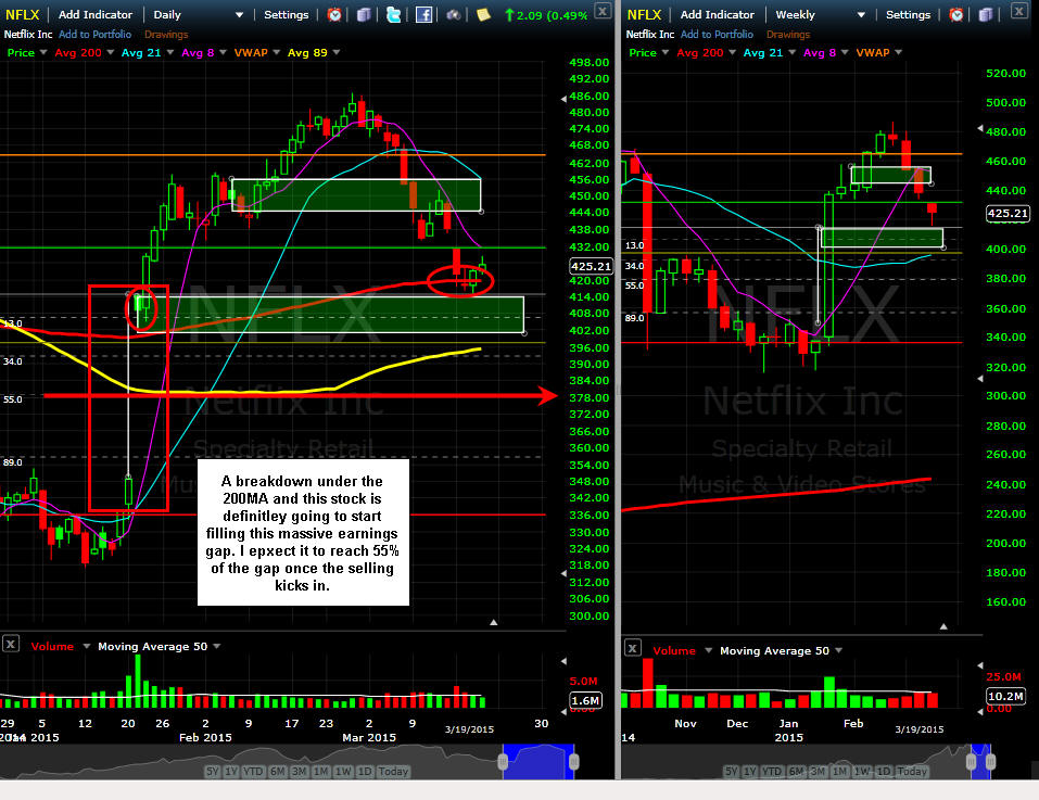 ===================================================================================================================== 11/15/15 - The power of the SGB is just too good of a SHORT ALL OF THEM signal. NFLX began to descend two days after my last post and then it gets a strong reversal that became another SGB and DOWN WE GO! Although I did not have any shorts posted to the site, I hope you were still able to get some shorts on and catch some nice profits this week. I will be looking for the next entry points and as I said before, I still keep some OTM calls in play every week with this stock. I am expecting the stock to full test the current largest SGB this week, and any positive news will be bought as investors really like this stock but maybe institutions don't have a very large appetite for NFLX shares at the moment due to some ramblings that GOOGL and others may be launching a streaming video business in the coming months. We know NFLX is currently the KING but they are also spent to the hilt and that can either be a lift like it has been for AMZN or a dead weight that will take them down if competition dilutes the content wars so for now I am still a long term bull on NFLX, but I will trade the direction / trend from week-to-week.