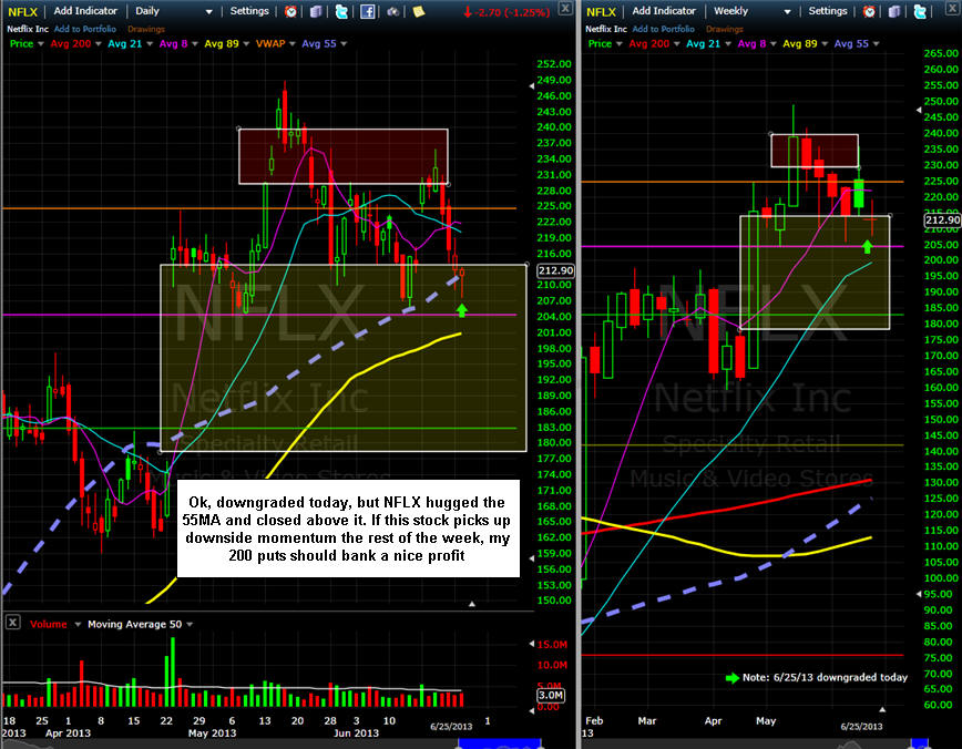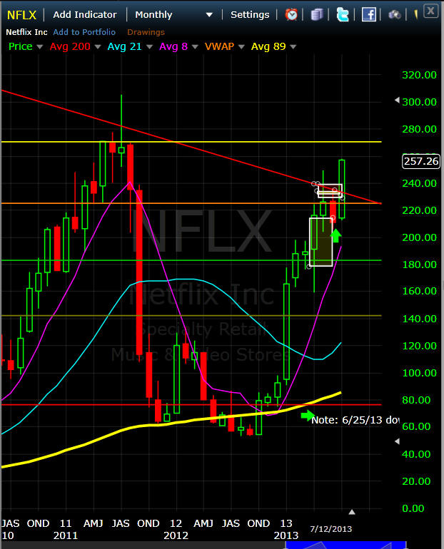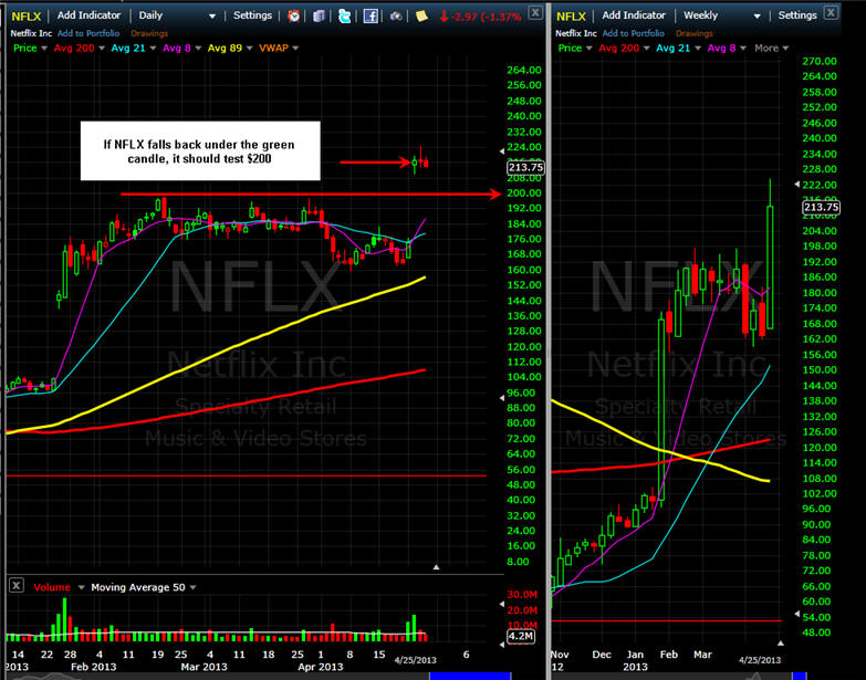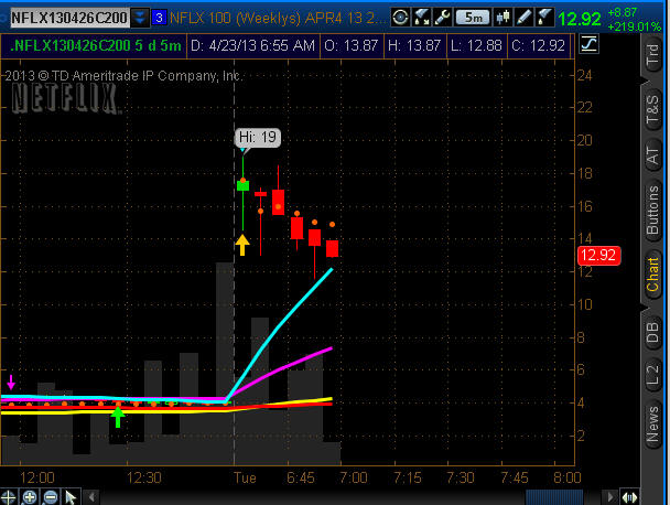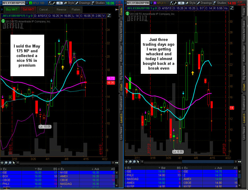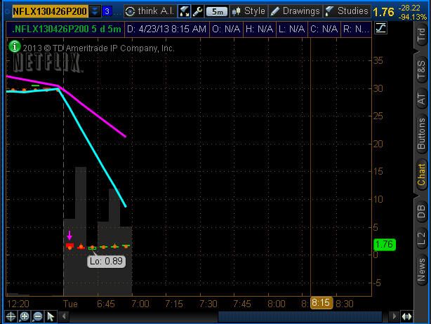 ================================================================================================== 4/23/13 - NFLX had a very SWEET day today jumping up nearly 25%!! I did not get any fills on my White Whale trades but I am still looking for one the rest of the week. If NFLX does not head higher tomorrow, I will be looking to add to my 200 puts in anticipation it will pull back to test that area. I closed my Naked Puts for a FAT profit! I bought a small position on the $200 puts