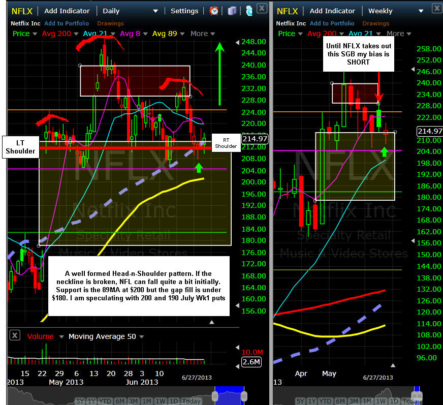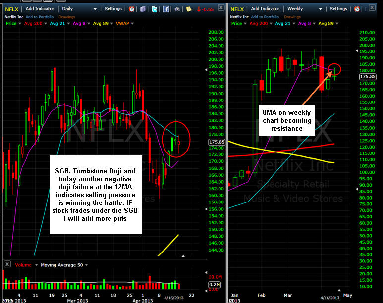 ========================================================================================== 4/17/13 - Selling continues today as the SGB and tombstone doji are proving to be accurate. Earnings are coming next week, so if GOOG has a strong quarter, NFLX can move in sympathy. I am loaded and hedged so I just need a big move. I will be adding some more positions on the 22nd.