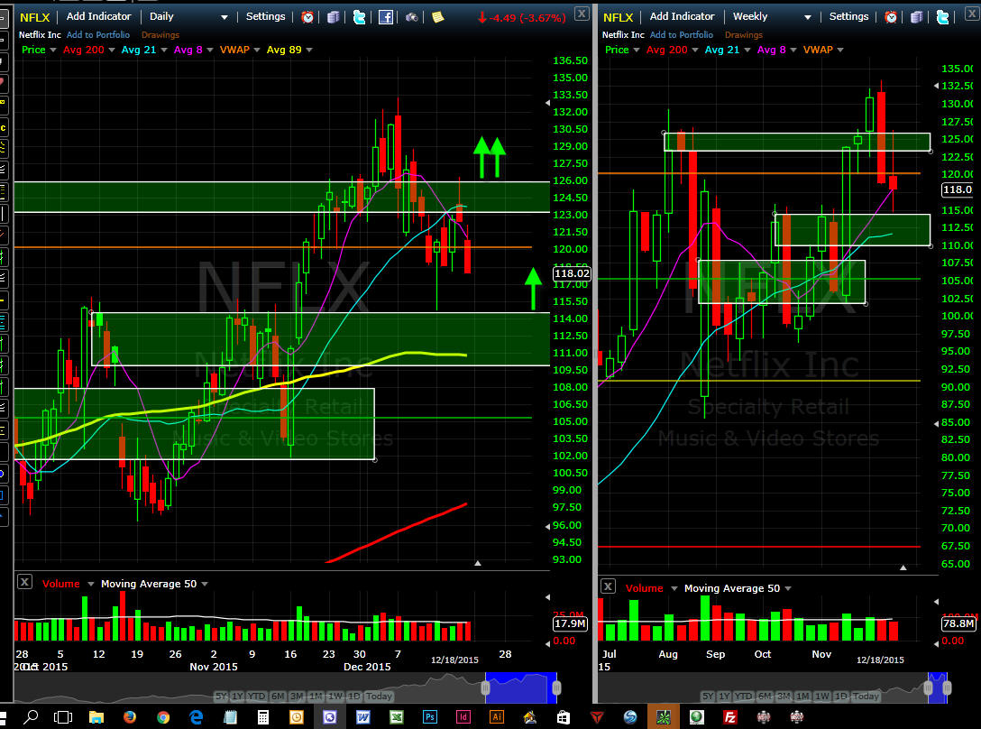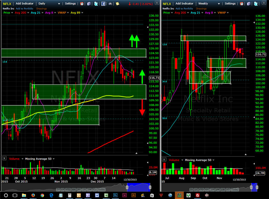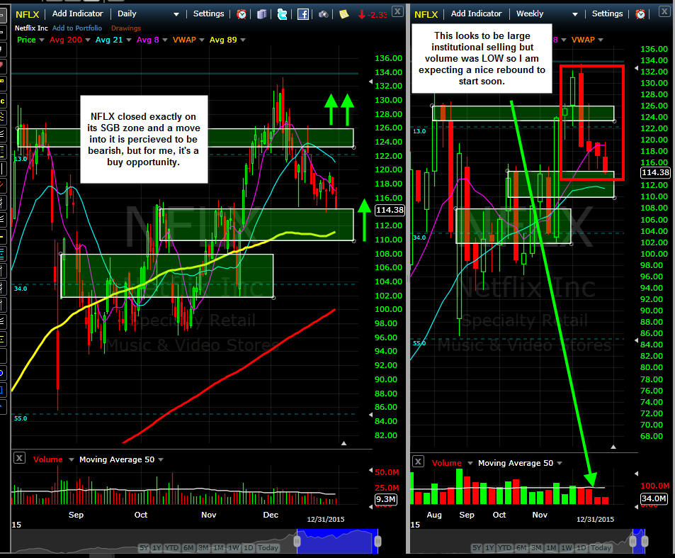 ============================================================================================================ 11/2915 - Final month of trading for 2015 and NFLX is looking like it wants to go higher but it has to clear out the current SGB zone and it tested it this last Friday. If we get a gap open Monday that holds after 15 minutes, then I am long shares and will start selling some put premium spreads. If the stock fails to hold here, then I want to get in on some short strategies down to the lower SGB zone at $115.00. I am a long term bull so any shorts I do place, I will take profits quickly and continue to buy OTM calls at a 10% move every week all of 2016.