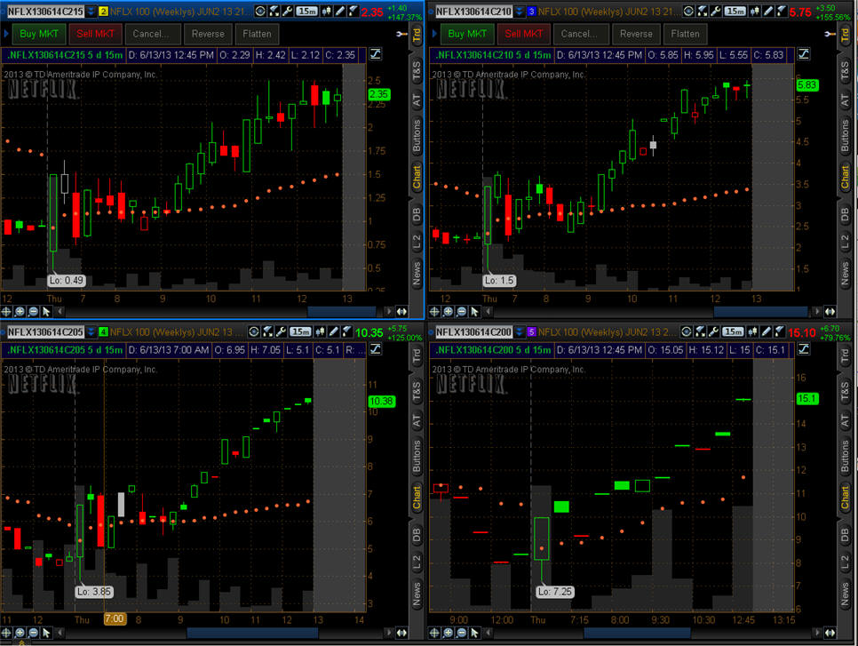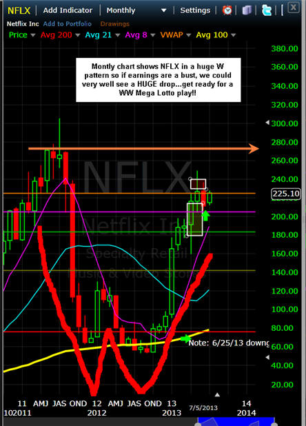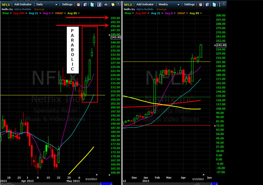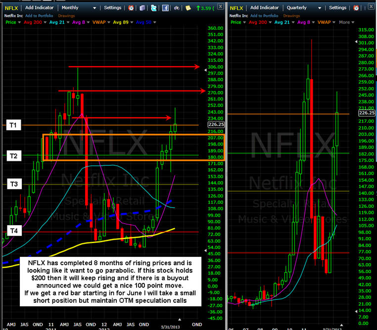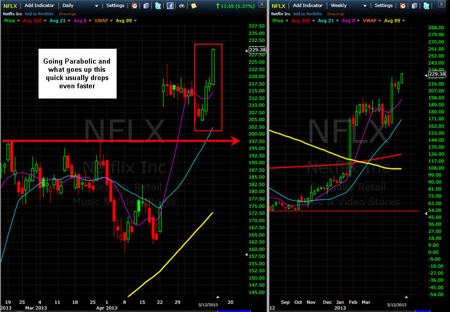 ========================================================================================= 5/14/13 - Making moves with the markets. I did not get filled on the 230 or 250 calls at the open, so I cancelled the trades and now I am fishing for puts. =============================================================================================== 5/13/13 - NFLX is back on my radar screen. What a glorious ride this stock has been since late Jan 2013. According to news reports, Carl Icahn has NOT sold any of his stake in the company and that is definitely driving this stock higher. Now, that may be the news story he wanted played out so he could indeed DUMP his shares. Too many times I have seen, heard and been the sucker to this very situation so all I can say is be cautious at this point if you have not been in this massive winner. At the end of the day, this company's stock price is up HUGE on future expectations. If you break down the guts of the storyline, then you have to scratch your head in amazement. The daily chart is definitely going parabolic so we should be looking for a blow off top signal soon. I was watching it trade around $230 all day and it could not get over this price. In fact the "high of the day" was pegged at $229.69 As you know, I am an observer of anomaly prices because I am convinced they are "insider" code. I am thinking this price point was pegged to say, "hey...we are about to screw everyone so DO NOT GET LONG BOYS...wink wink!" We will know if I am right in the next few trading days. If you think this is a signal to get LONG then place orders 34% - 55% UNDER current prices...DO NOT CHASE because the implied volatility in these options are ridiculous. For example, the ATM 230 Weekly calls are currently priced at $4.90. That means NLFX has to trade at $235.00 by Friday to guarantee you break even. Sure, it could go up another $11 bucks tomorrow or this week, but if NFLX does not move higher from minute one tomorrow, the market makers will wipe out this premium and TAKE YOUR MONEY! Lets watch this strike for the rest of the week as a learning lesson.