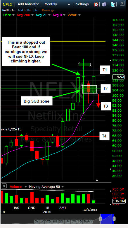 The monthly chart is now very bullish and with more revenue coming in and content deals abound, we should see NFLX take off to attack that $1,000 pre split price point. If things go bad, then the SGB zone is the short range under $108 so you want to have some BCS in November just in case, but my bias is BULLISH.