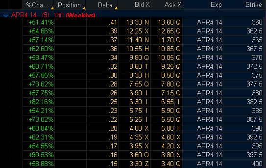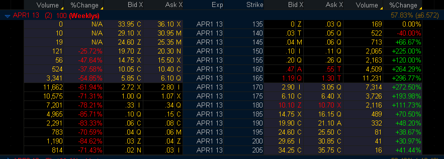 I bought back my Apr13 190 puts and almost at a break even...I love selling premium on volatile stocks because the market makers collapse price with small moves in the stocks price. I sold the May 175 Naked Puts and took in a fat $16.00 in premium!
