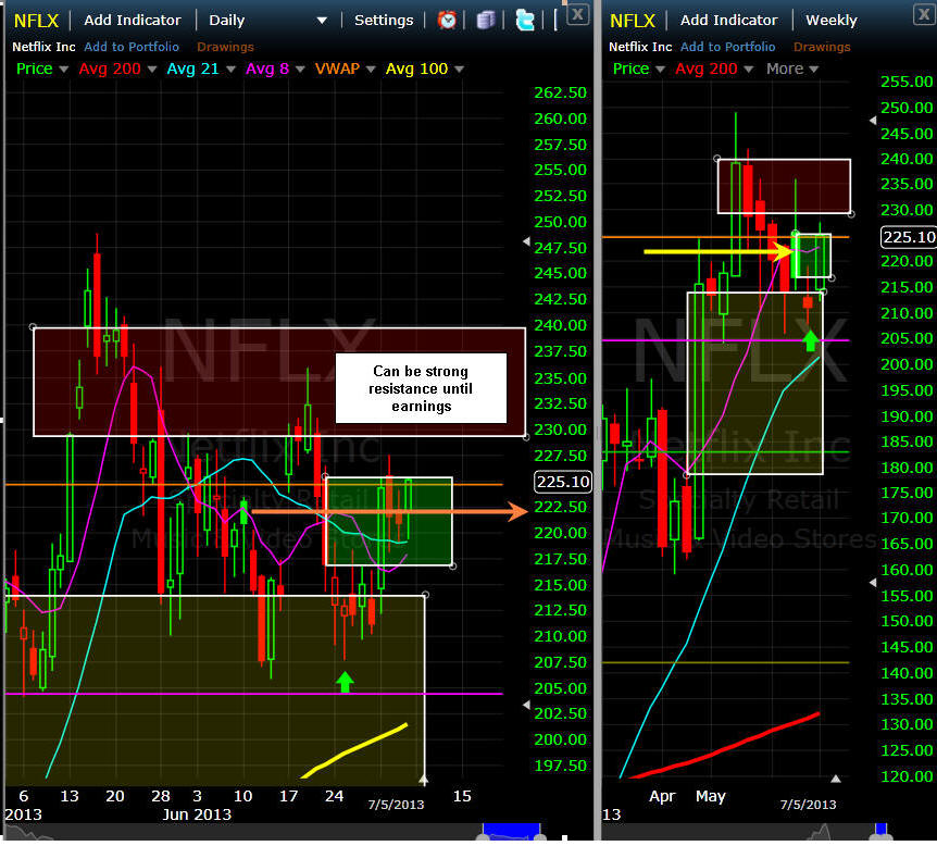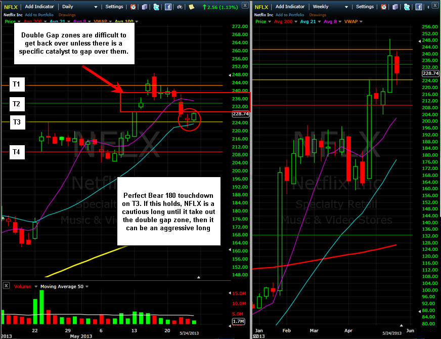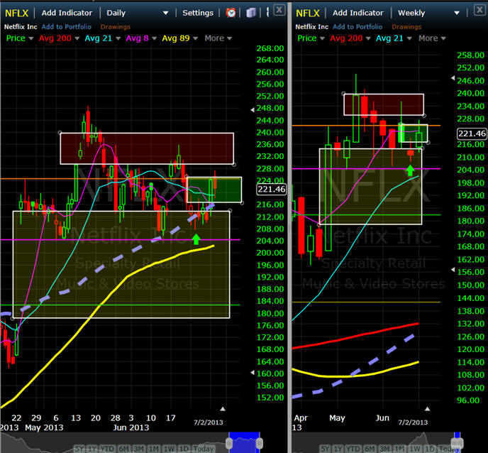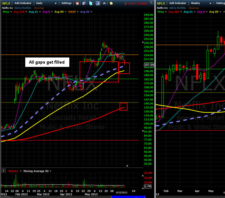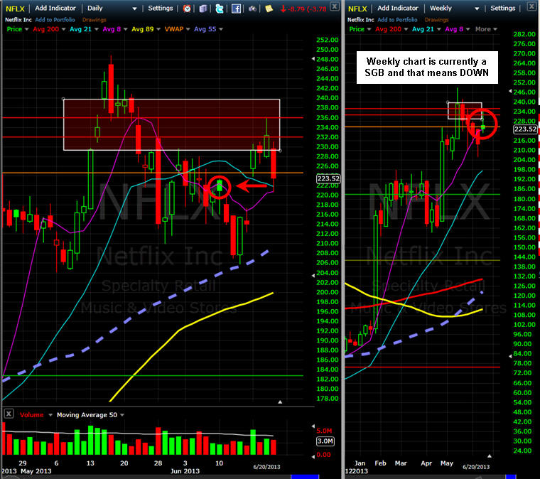 5/27/13 - NFLX tested the 21MA on Thursday last week and moved up slightly on Friday. the zone for NFLX to get back over is now a double gap which can be difficult unless there is some compelling news. As you can see from the daily chart, the recent selling was pretty strong; however, the volume was light indicating there are no BIG sellers present at this time.