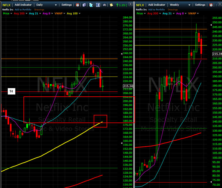 Notice how NFLX just dropped right through my long term trend channel lines and the 200MA on this 15 minute chart. Next stop is $180 and maybe even lower it the rest of the week looks like today. I am hoping for the big drop this week and then we get the massive rally back up as the shorts will cover rapidly on any rebound at technical bottoms. So, be sure to watch for the standard Fibonacci retracements and moving average pivots.