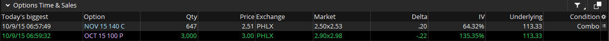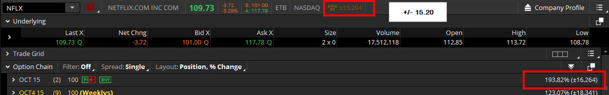 10/11/15 - Earnings this week should produce a very nice move in NFLX. Since they are raising prices, that means more profits and higher valuations for this very popular stock. New projections are coming in at $140 so I am sure there will be a slew of upgrades hitting the news wires this week. The IV is a massive 143% so buying any calls is a total crap shoot and selling premium is the best bet but we know NFLX can CRUSH you if you sell naked calls. Since this stock has so much upside probabilities and future growth I would ONLY sell naked puts because I have no problem owning shares at these price levels.