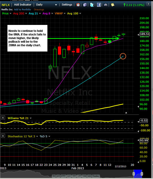 ================================================================= 2/13/13 - Will NFLX take out $200 or will it be the kiss goodbye for the immediate future? I think the damage to the bears psyche is very established so any dips going forward will be bought with a vengeance. Today the markets pulled back and NFLX powered higher darn near 5%! That is what I call a massive bullish bias. We still have two days left in the week, and for me, it has to clear and close over $190 or I will look for some puts at the close tomorrow for a Friday Lotto Trade. I am bullish on this stock so if no pull back, then I will start some calls with March expiration and add on dips. Now that the "news" is played out, you have to buy more time to catch the moves higher. Of course, I will be on lookout for weekly lotto play opportunities with this stock.