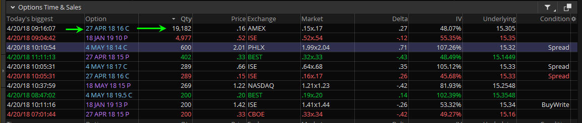 =========================================================================================================== 4/21/18 - SNAP is about to be "snapped up" as investors jockey for position on this social media stock. Friday there was a HUGE CALL purchase as someone is speculating the stock will breakout above $16.00 a share this coming week. With all the momentum in TWTR and upset in FB, investors are looking for fallout benefactors; and SNAP is definitely a popular choice—it's a cheap stock to take gambles on with OTM options. This looks like a wild card lotto trade...hmmm...one of my students? They are placing a $306,912 bet which will be interesting to see how it plays out this week; especially since earnings are not until 5/1/18 so it appears someone may know something is going to be announced this week—that is a huge amount of money to just lay on the pass line for a week!