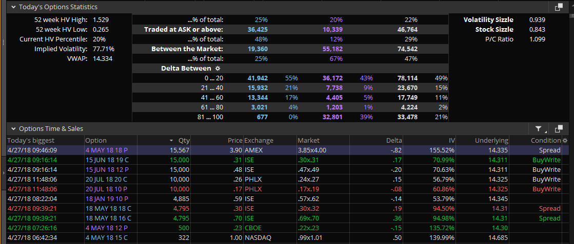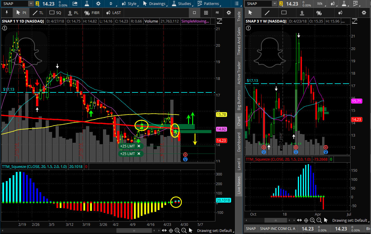 4/29/18 - No moves last week and that speculation play went bust. Hmm, a huge bet that cold have maybe been a covered call, if so, it was a nice payday for that trade. On Friday I see a whole lot more activity but looking like covered calls are in place and if the company surprises, we get a nice pop. After my last comments, the stock broke through the SGB zone giving us a buy signal and then things quickly revered and now a second SGB is in play. The TTM Squeeze is showing the beginning of "red" dots so a definite move is coming. Call interest is 3:1 over Puts which makes it harder to go up as investors are already in position to take profits on higher moves so I am not anticipating a Moby Dick here but you just don't know until its revealed. It took years for FB to break out over it's IPO price and now look at the stock but I do not think SNAP has the chops to eclipse FB user count and if they can't show solid revenue growth, then big money is not going to buy in for the long term. What I do know is small stocks can make dramatic percent moves so speculation with wild card strikes 20% OTM is definitely in the range of Lotto Trades opportunities; therefore, I am adding to my $17 call now that I can get them at half off the last fill and I will BUY more time on the Put side at the $11 strike.