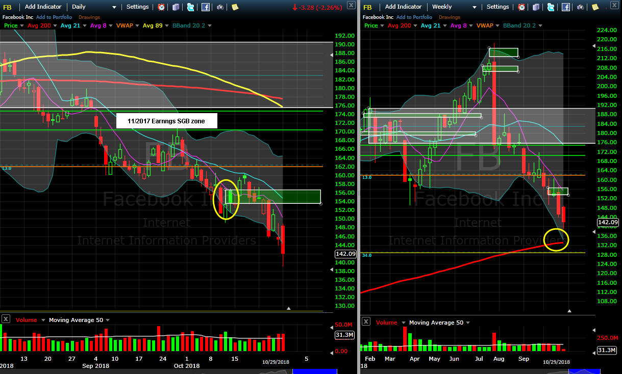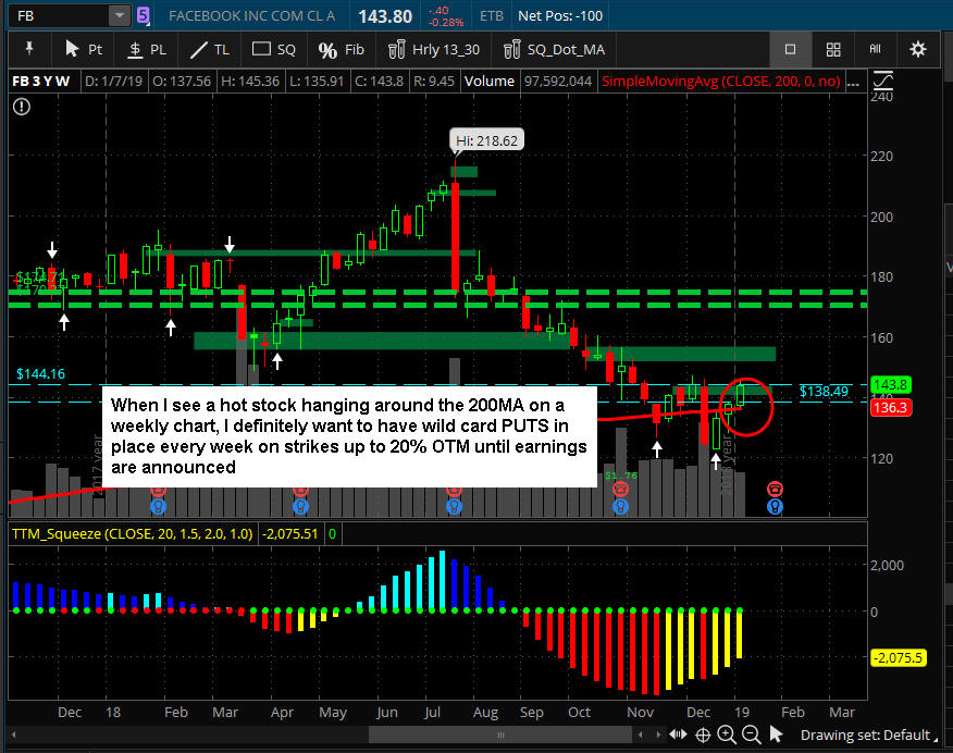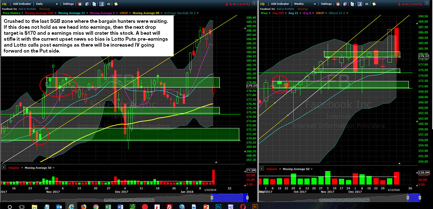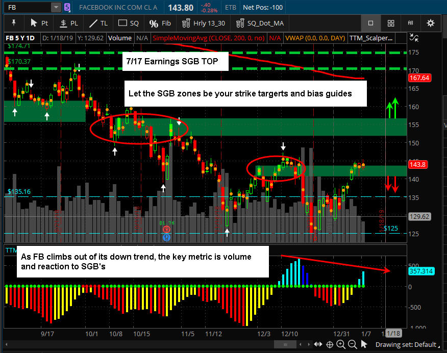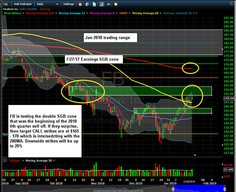 If the company can show strong ad revenue growth amid the scandal, massive damage control hiring and multi-country government scrutiny, fines and restrictions, then I would expect a very strong multi-week rally post earnings back to all time highs. On the other hand, if they report a dismal quarter, and that quarter is LESS than a year ago, I am anticipating a massive initial DROP and multi-month slide lower and lower; therefore, my plans are to trade around the SGB zones with credit spreads and fish wild card Lotto Trade PUTS as we get into the final week of trading before earnings are released on 1/30/19.