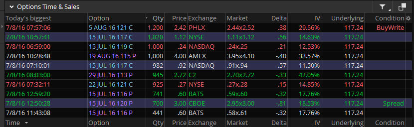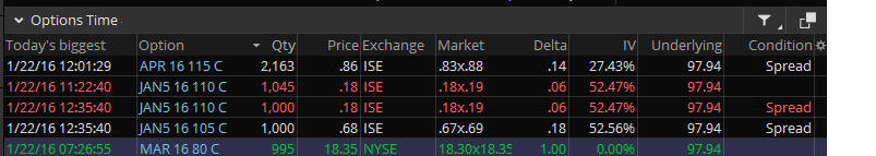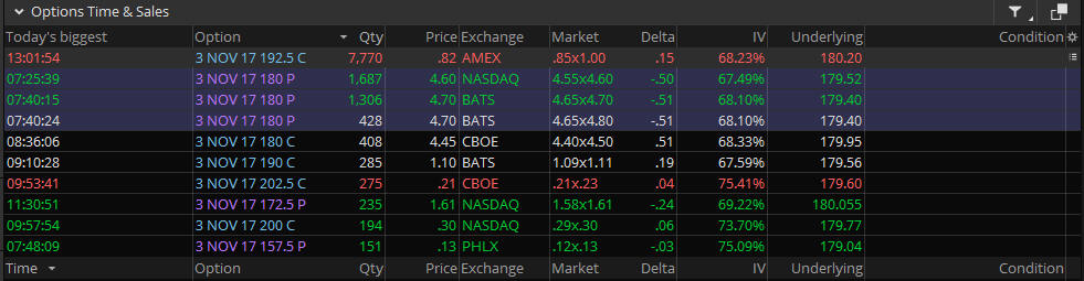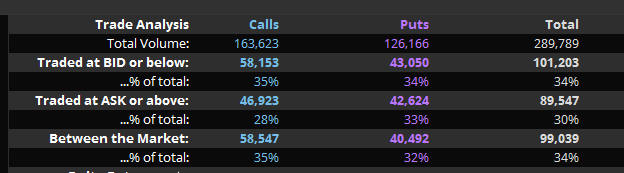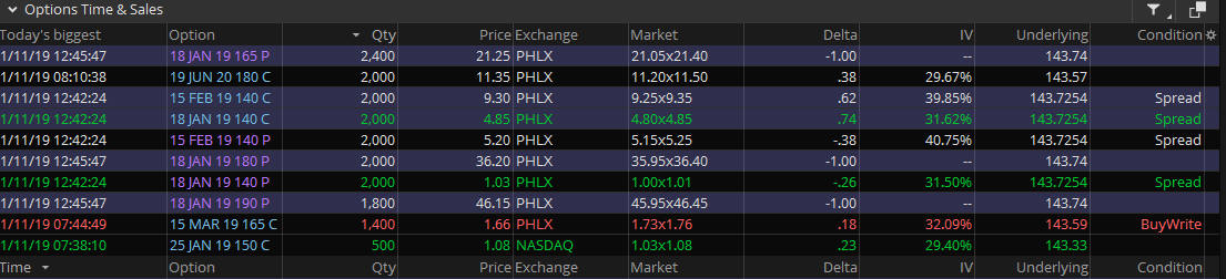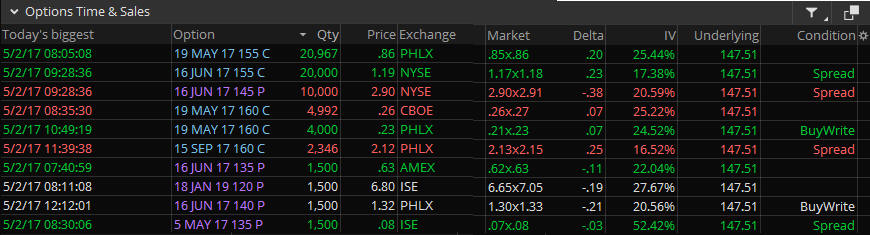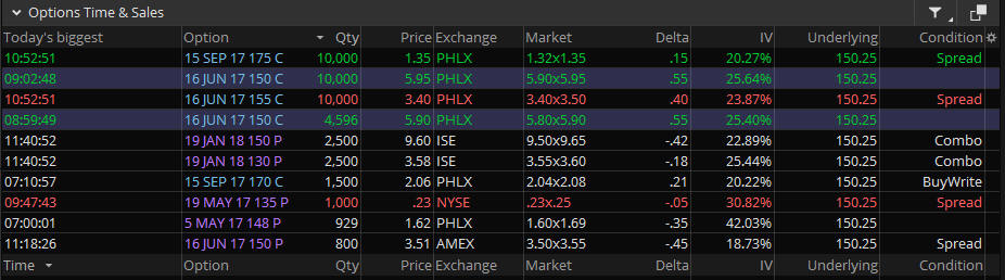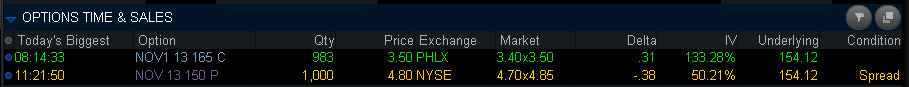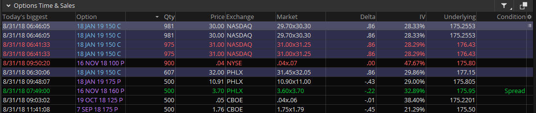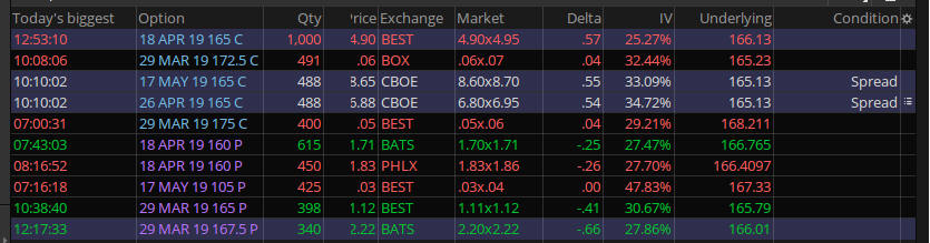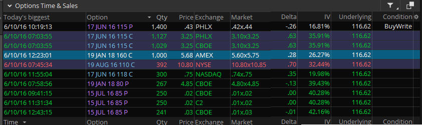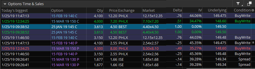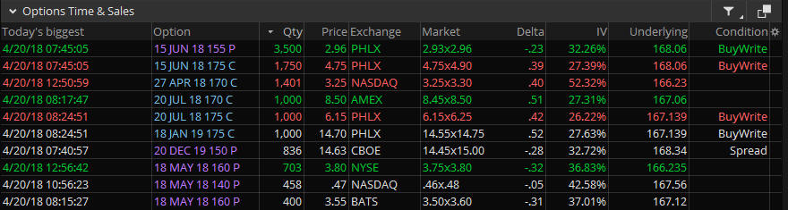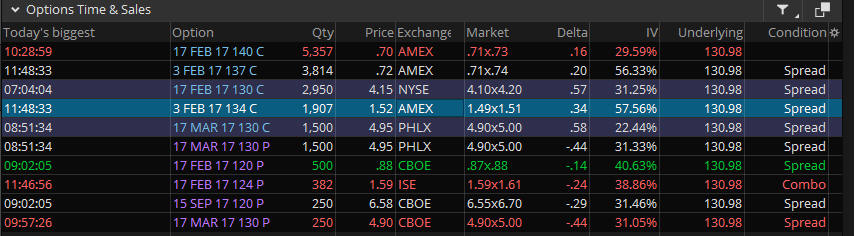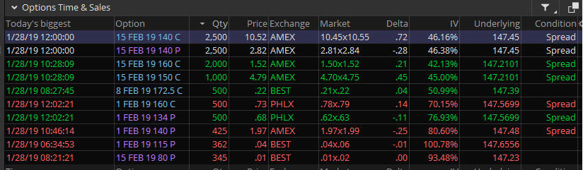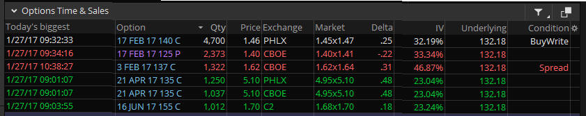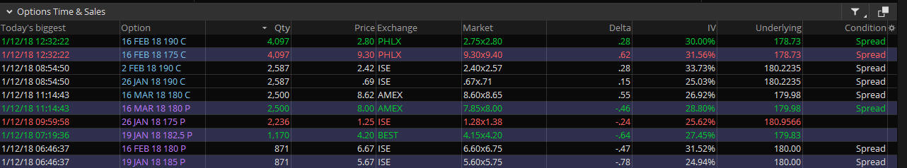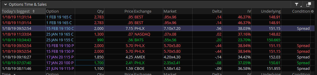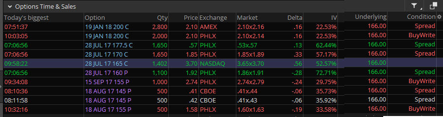 Looks like someone sold some naked calls or covered calls on the Feb1 165 calls (red means traded at the BID)