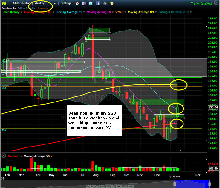 1/16/19 - FB has been creeping higher as markets firm up and earnings begin. Tomorrow is NFLX which could have some impact on FB since it is in the "FANG" bunch, so we should start laying our weekly Lotto Trades and follow the money. FB has risen nicely since the beginning of the trading year; and looks to ready for a move into the upward SGB zone at$152-155 as we head down the road to earnings. I am placing my weekly Lotto Trades tomorrow and Friday, so follow along if you like or keep on laying those orders on your "go to" stocks!