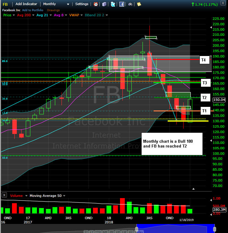 1/21/19 - A DOJI close at the SGB zone could have FB ready for a solid move come earnings time. Will there be a "surprise" pre-announcement like we had with NFLX? We can't know that for sure as retail traders; therefore, we have to speculate and place orders daily to get positioned for a move. There will be a lot of anticipation with this quarterly report; and I am thinking some long term decisions will be made by big fund managers for the 2019 trading year.