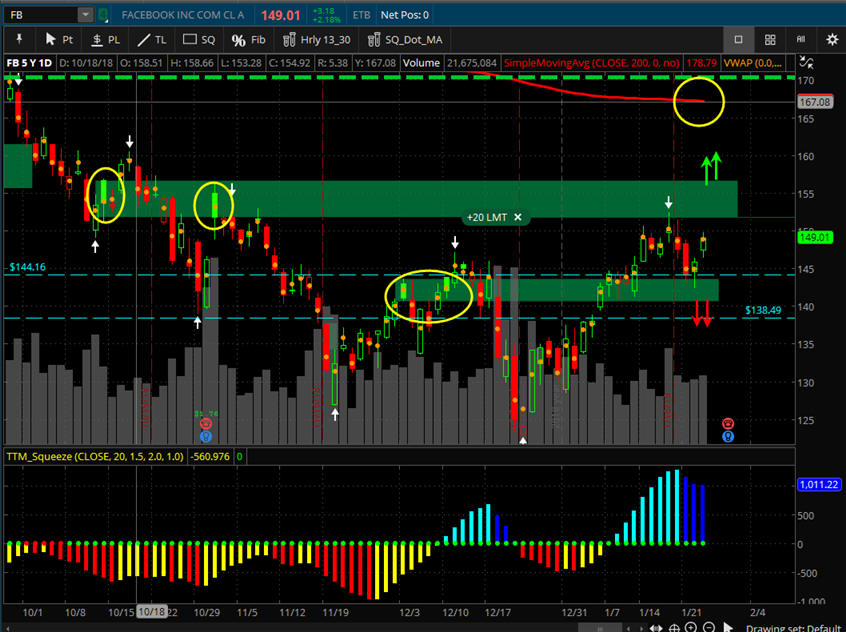 1/27/19 - This week FB will report earnings and I am anticipating there will be some decent movement this quarter since we have multiple SGB zones. I am placing my Lotto Trade orders, spreads and shares on Monday and will adjust into Wednesday as need be. The 200MA is at 167.00 which is well above the multi-SGB zone at $155 so there is where my target strikes will be. As for the wildcard play, I will be doing PUT strikes below 140 or up to 15% OTM.