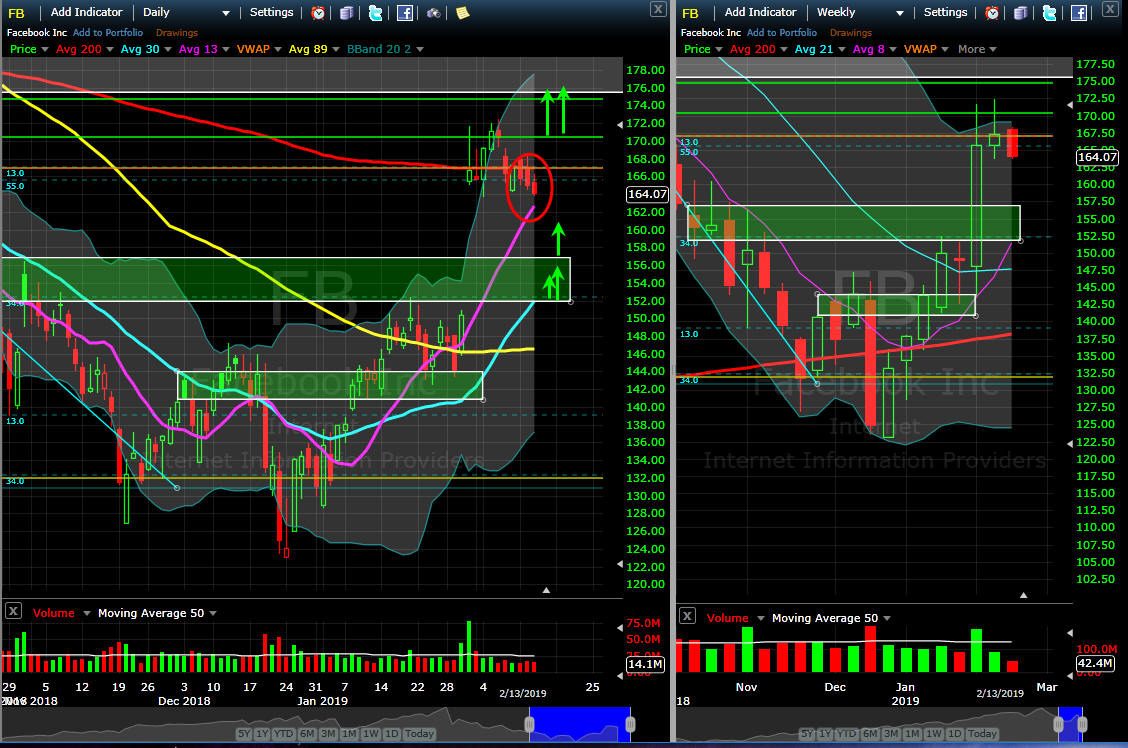 4/11/19 - Last week FB made a very nice move through its long-term SGB zone and has not had much follow through since. Today, it closed as another SGB and so we now have a pivot point to play off of. If they get good news, UP she goes and any bad news and it can easily drop under that long-term SGB zone.