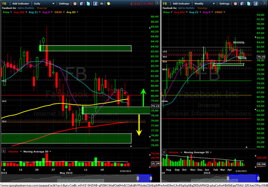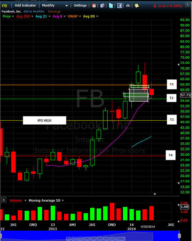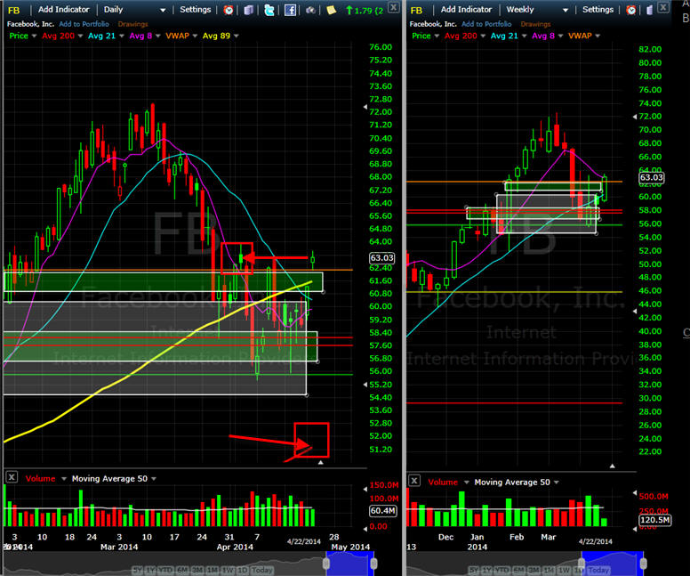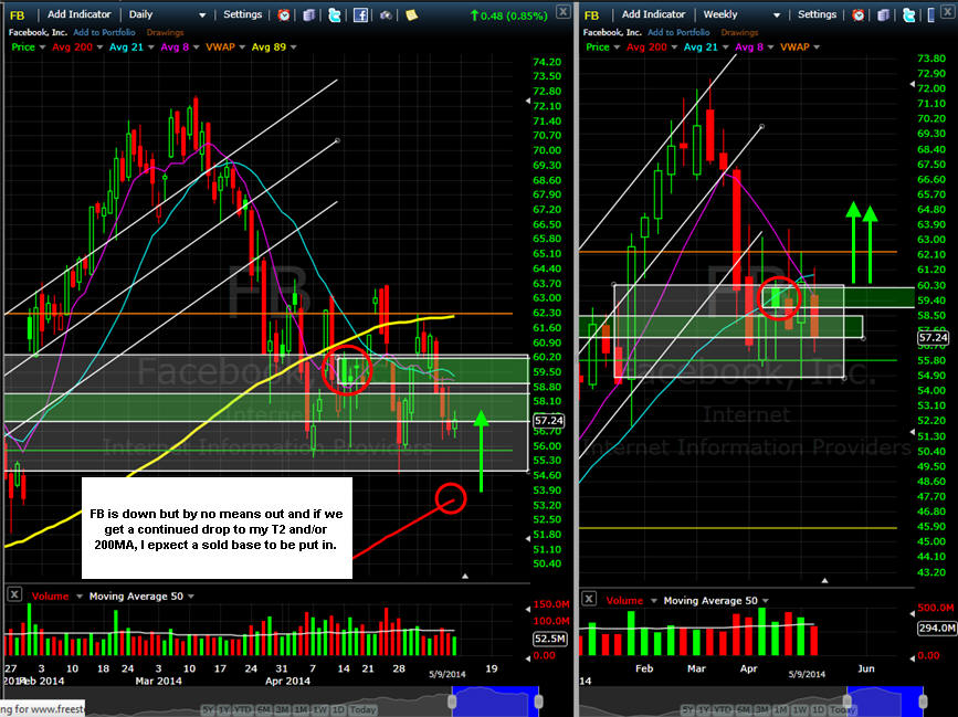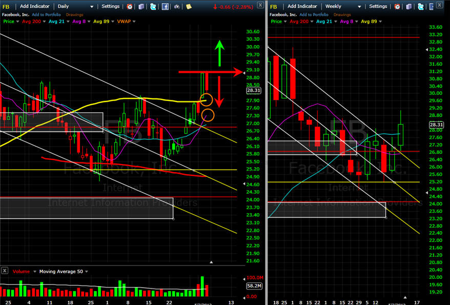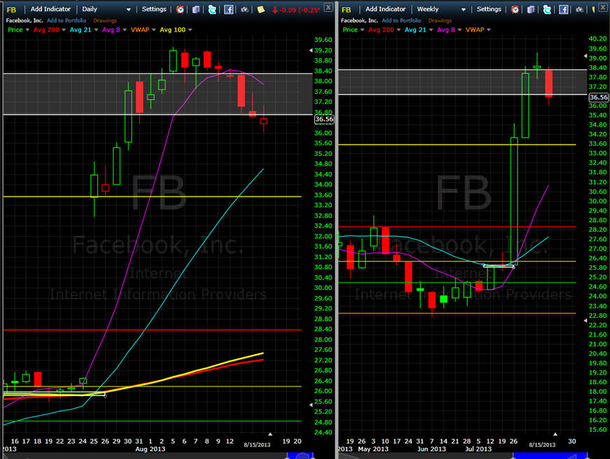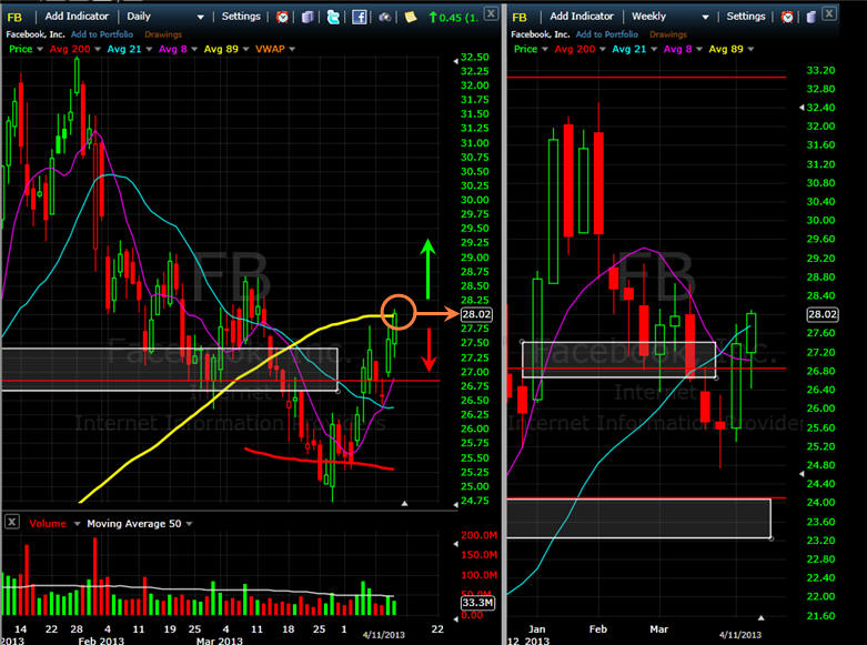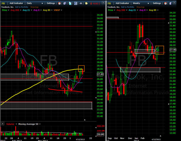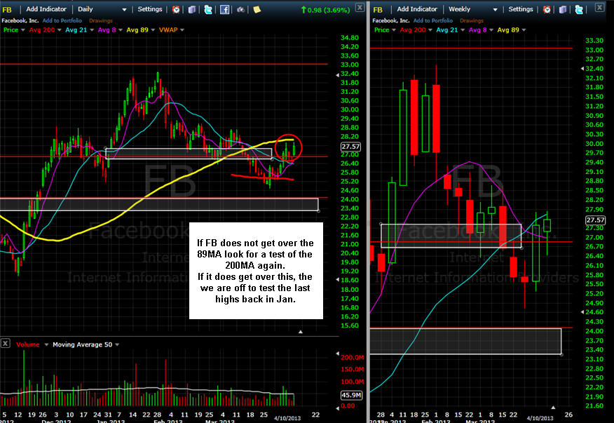 =============================================================================================== 4/13/13 - Slapped back down but not taken out yet. The 8 and 21ma on the daily are holding, and with the 200MA still pointing down, that will make it difficult for FB to hold onto any gains until the earnings are released on 5/1/13. There will be lots of volatility as this will be a heavy week of earnings with several big names reporting. If GOOG does well and reports increased or decreased mobile revenue that should lift or depress FB so be ready for that. The 89MA is proving to be the roof for this stock for now, so I would be a buyer if it moves to take it out or we get a drop back to the 21ma.