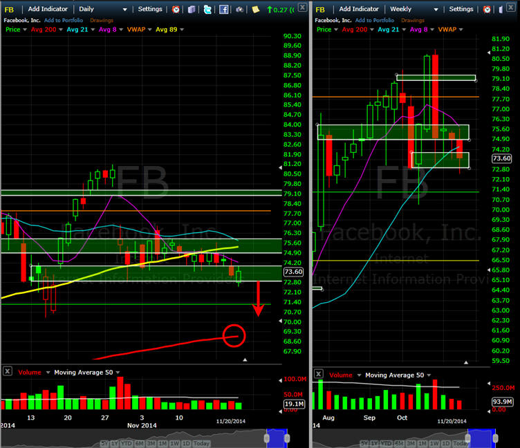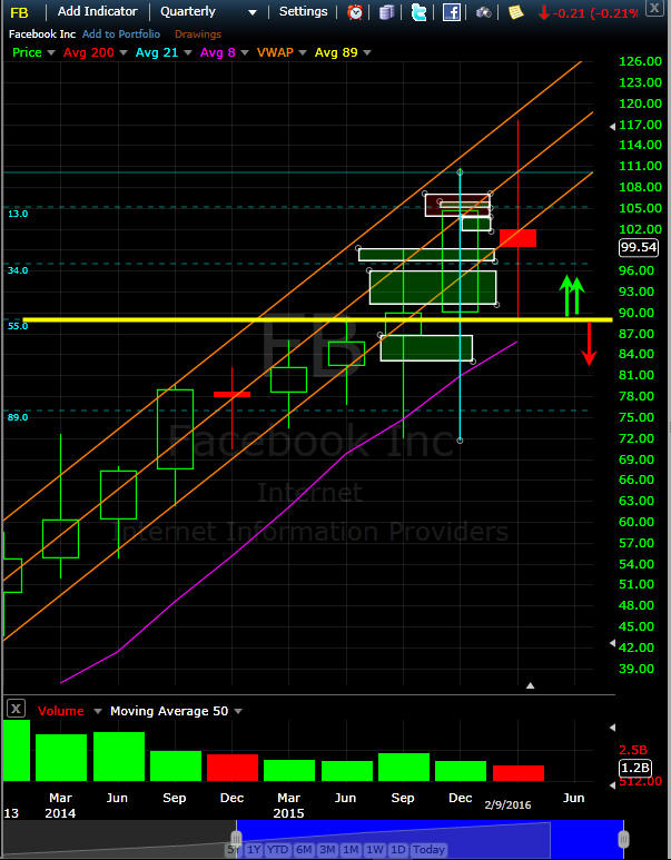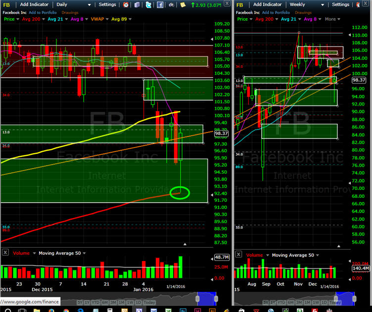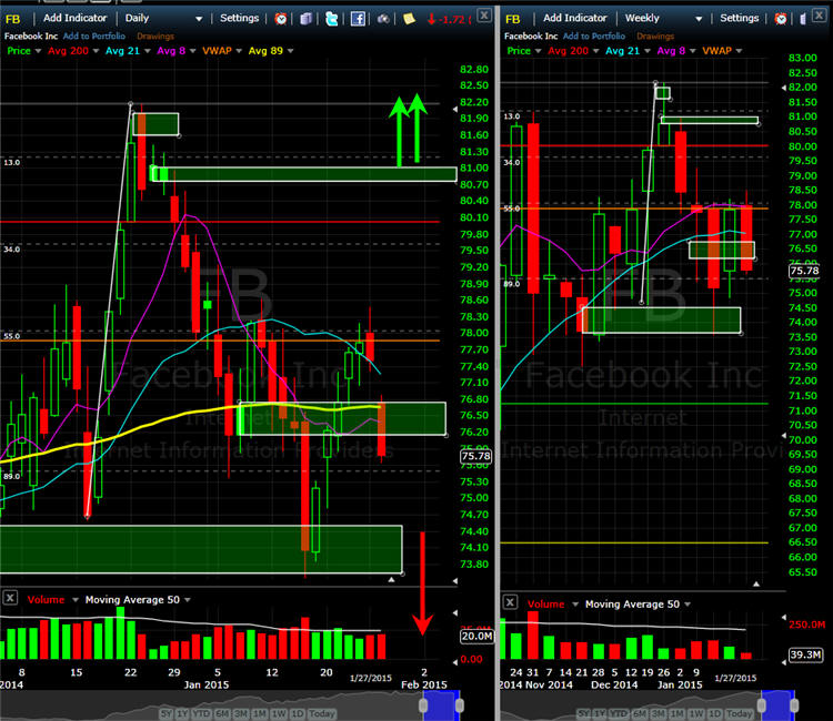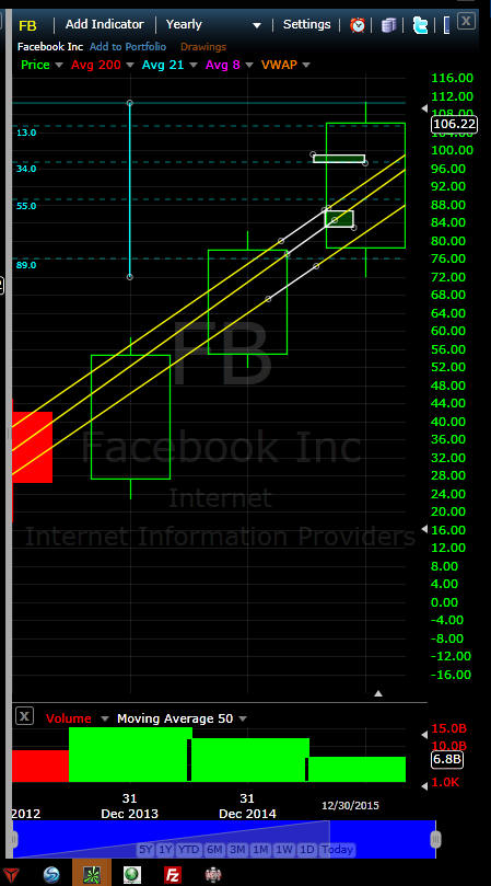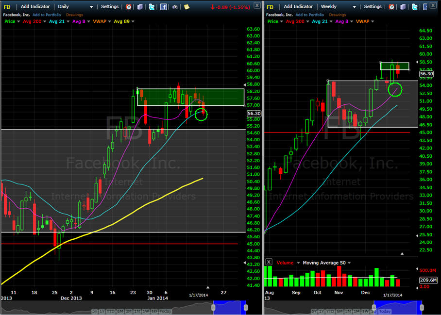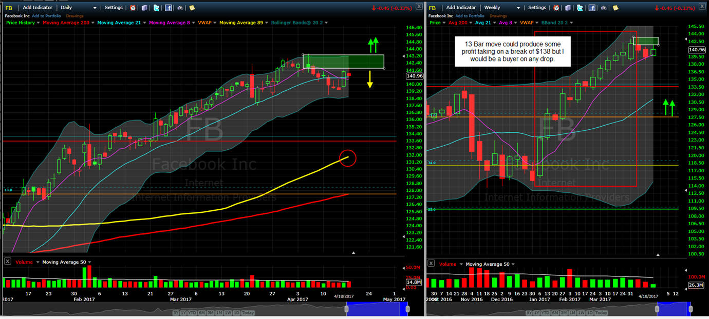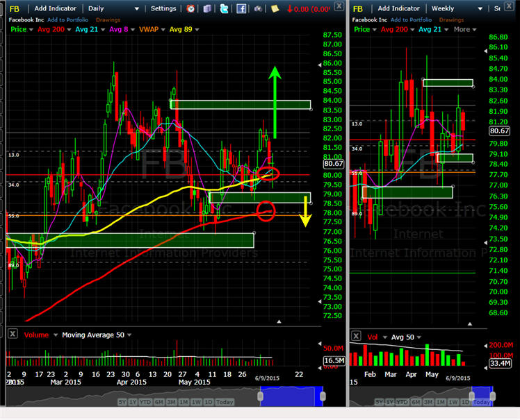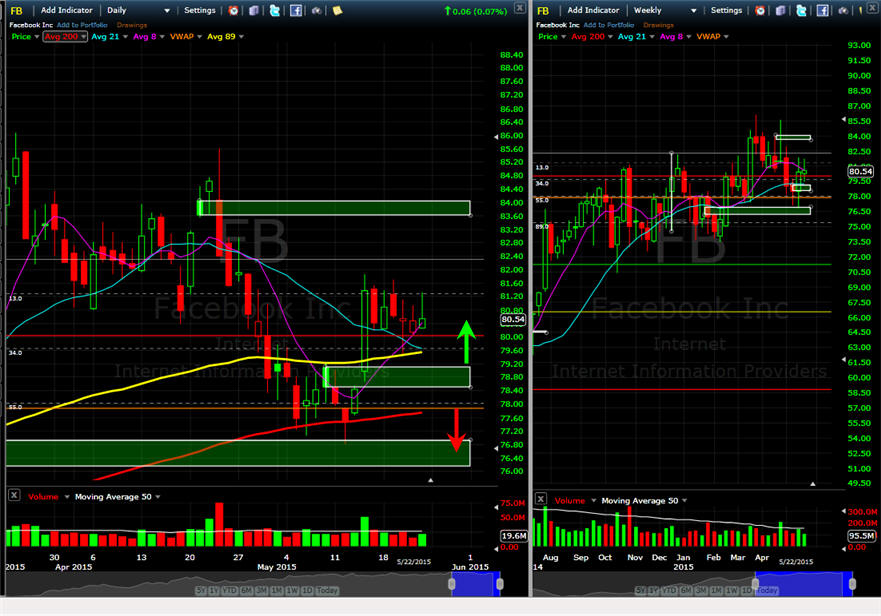 =============================================================================================== 4/13/13 - Slapped back down but not taken out yet. The 8 and 21ma on the daily are holding, and with the 200MA still pointing down, that will make it difficult for FB to hold onto any gains until the earnings are released on 5/1/13. There will be lots of volatility as this will be a heavy week of earnings with several big names reporting. If GOOG does well and reports increased or decreased mobile revenue that should lift or depress FB so be ready for that. The 89MA is proving to be the roof for this stock for now, so I would be a buyer if it moves to take it out or we get a drop back to the 21ma.