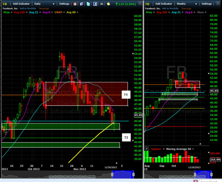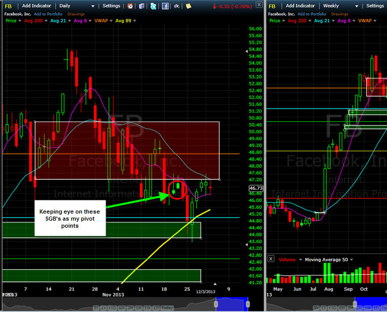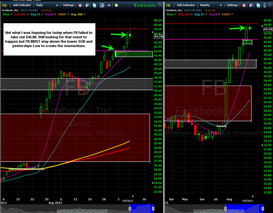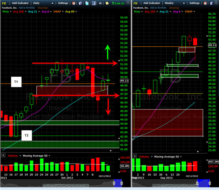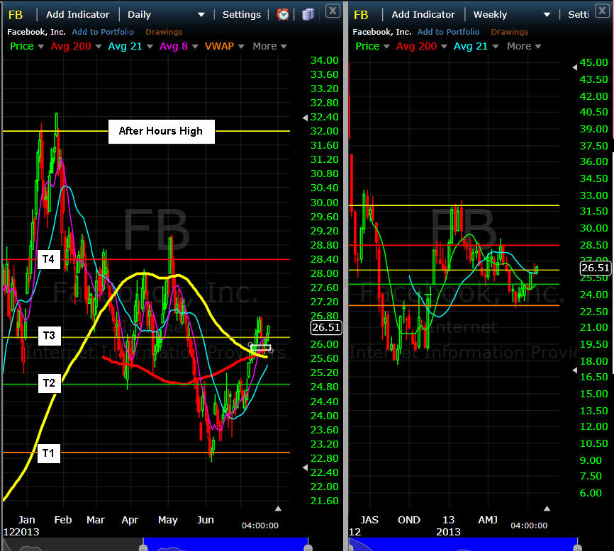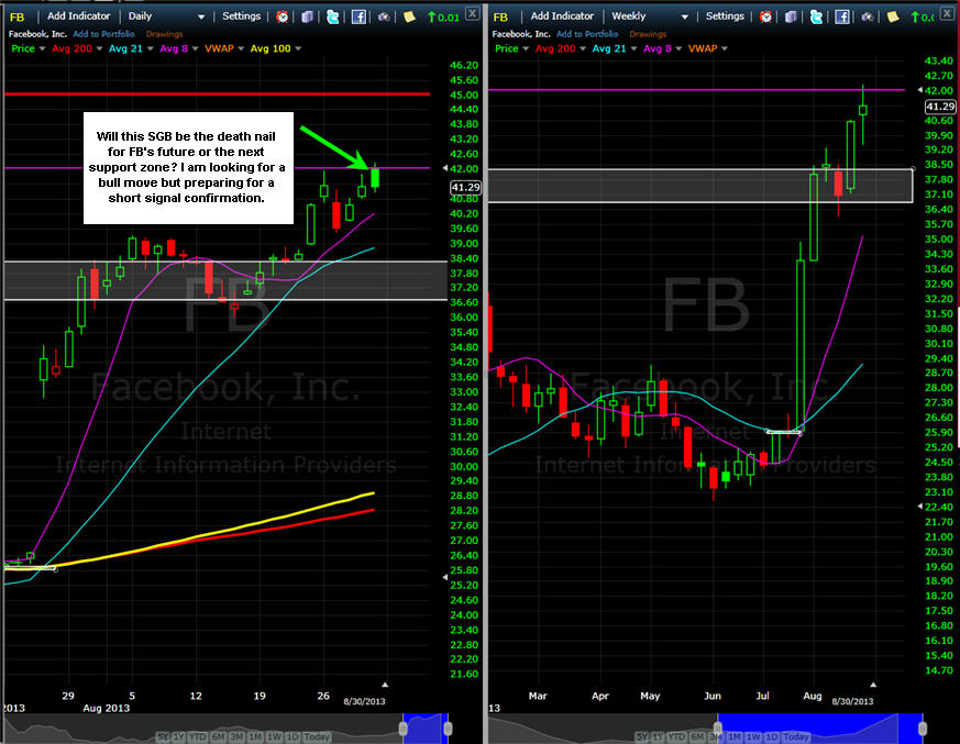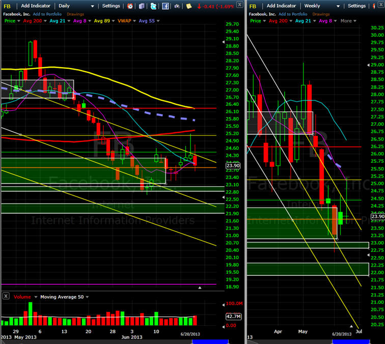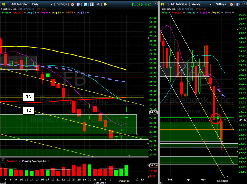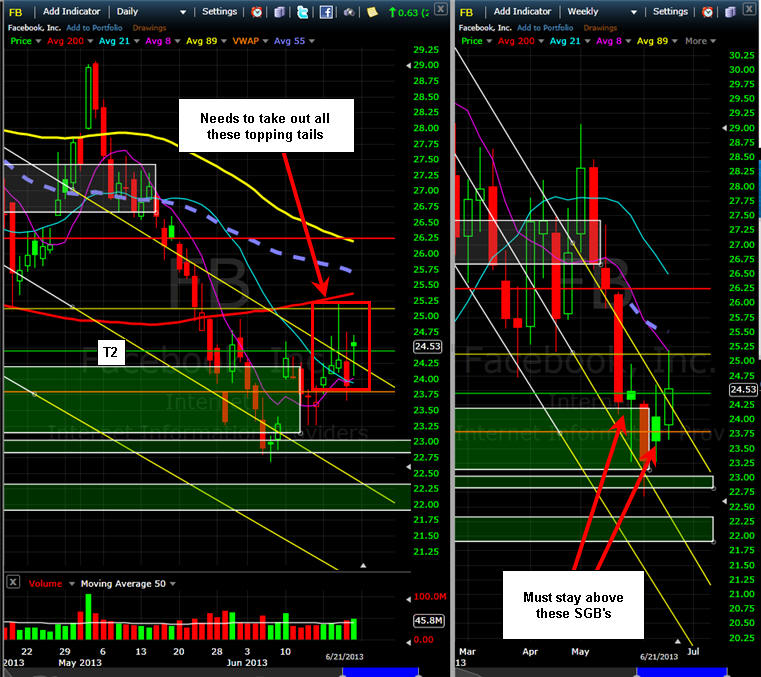 ============================================================================================= 7/10/13 - I see FB is coming back to life. I have not been paying any attention to it and for now I am just keeping the positions on that I have. ========================================================================================== 6/23/13 - A decent rally on Friday brought some life back into my long shares and naked puts. I am not happy the day ended as an SGB, but since it has a long bottoming tail, that may be good enough to keep the bulls interest, but until it takes out the topping tales form last week, FB is vulnerable to more selling pressure. Since I am long a lot of shares, I will sell covered calls if it fails to hold over T2 this week. The weekly chart is promising so long as FB stays above both SGB's there.