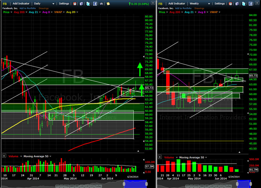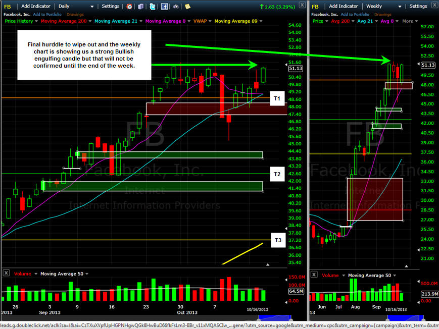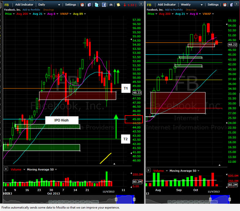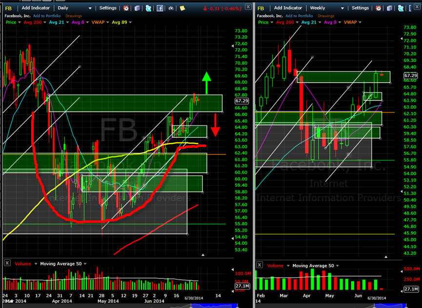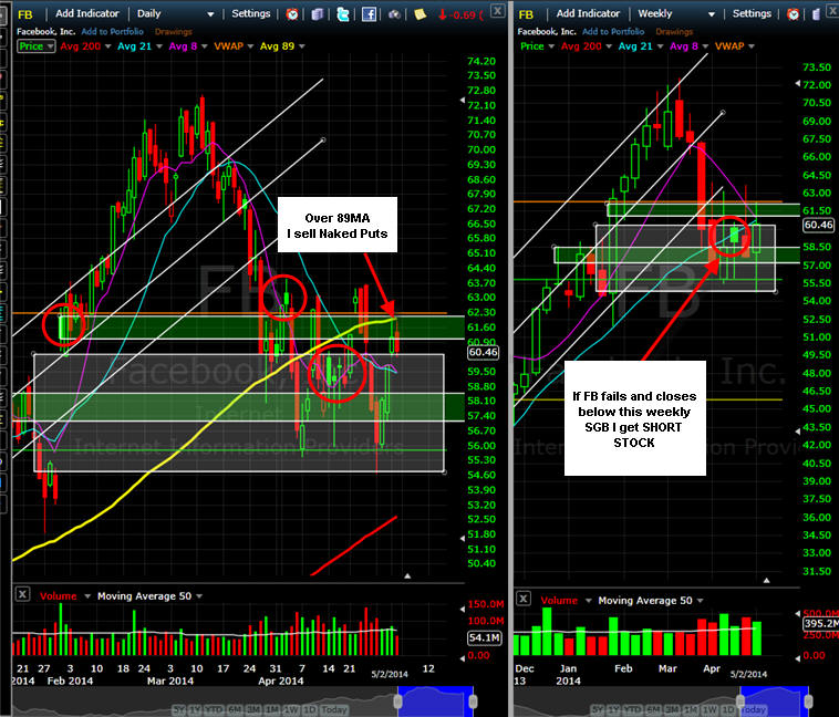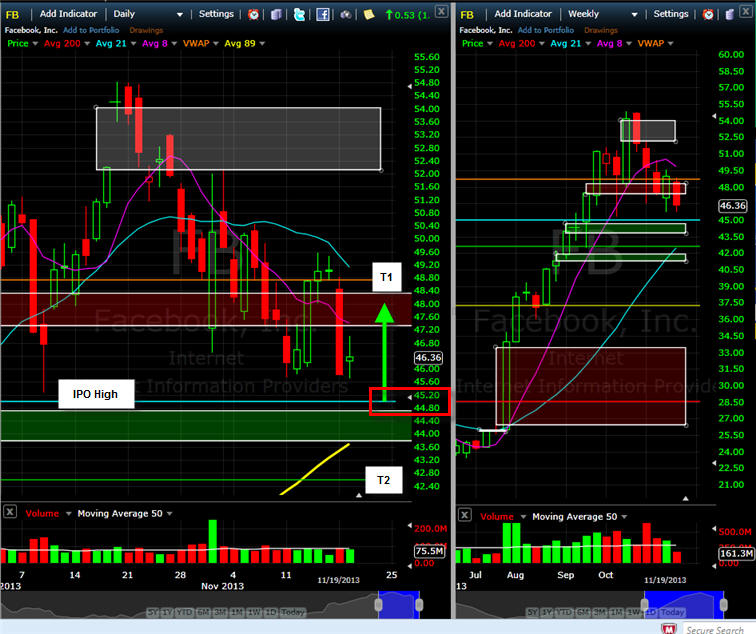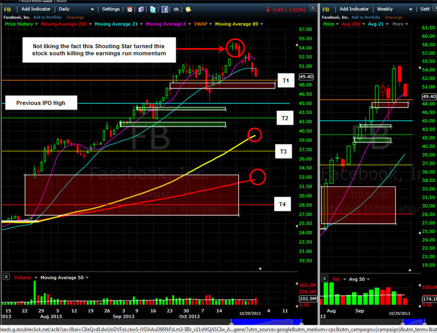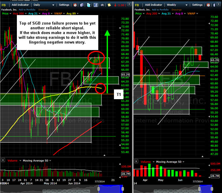 ============================================================================================= 7/10/13 - I see FB is coming back to life. I have not been paying any attention to it and for now I am just keeping the positions on that I have. ========================================================================================== 6/23/13 - A decent rally on Friday brought some life back into my long shares and naked puts. I am not happy the day ended as an SGB, but since it has a long bottoming tail, that may be good enough to keep the bulls interest, but until it takes out the topping tales form last week, FB is vulnerable to more selling pressure. Since I am long a lot of shares, I will sell covered calls if it fails to hold over T2 this week. The weekly chart is promising so long as FB stays above both SGB's there.