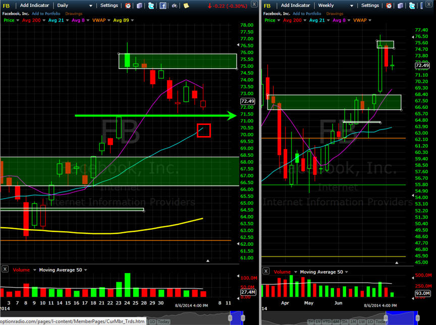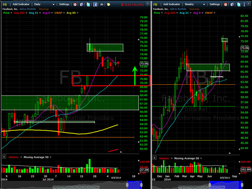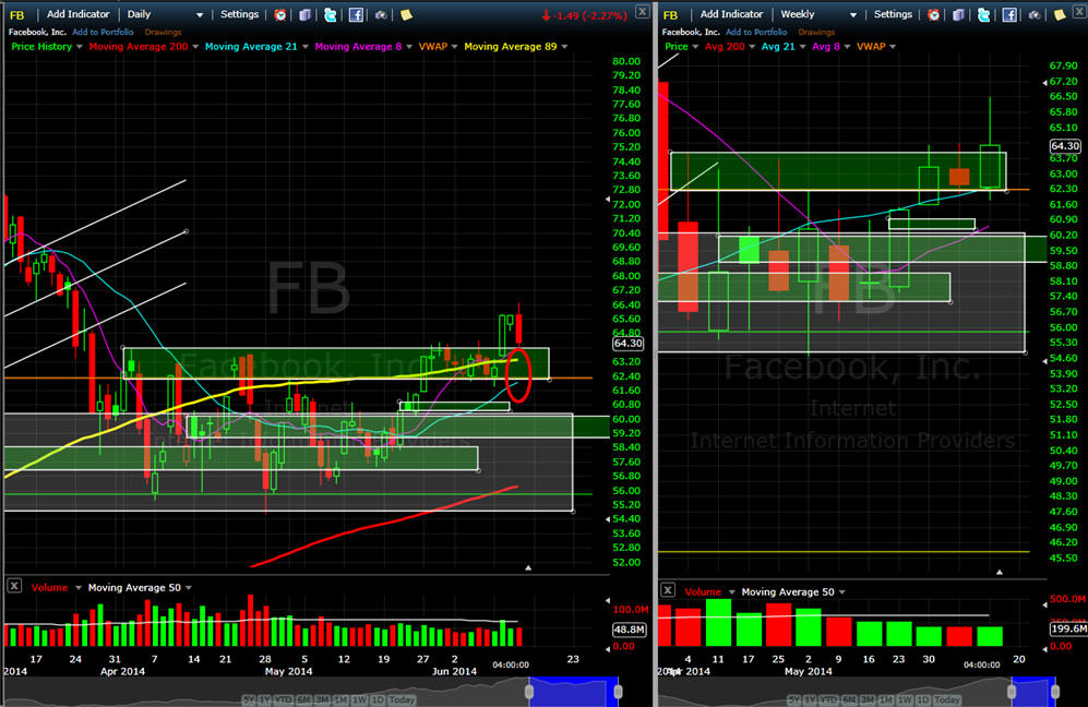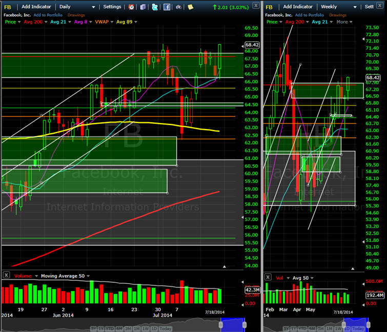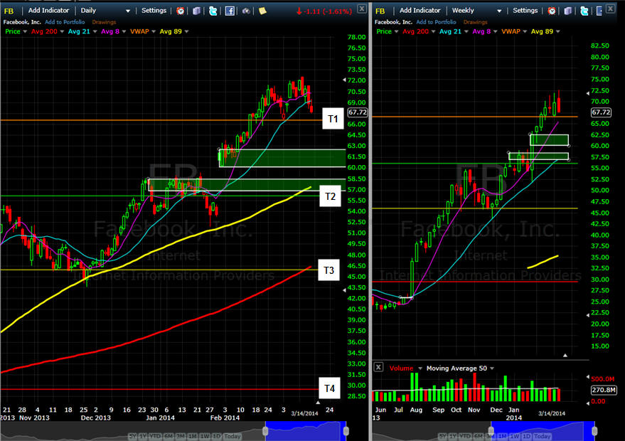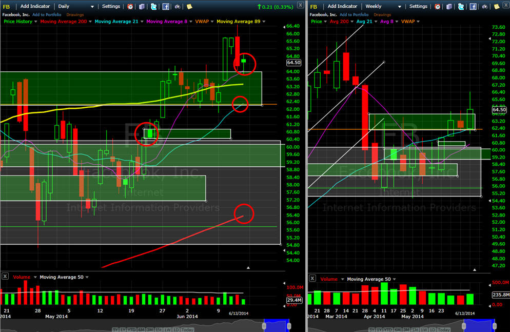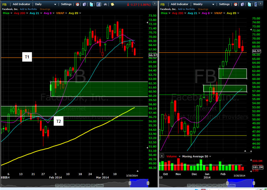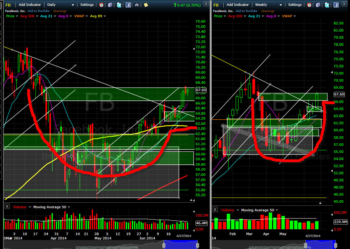 ============================================================================================= 7/10/13 - I see FB is coming back to life. I have not been paying any attention to it and for now I am just keeping the positions on that I have. ========================================================================================== 6/23/13 - A decent rally on Friday brought some life back into my long shares and naked puts. I am not happy the day ended as an SGB, but since it has a long bottoming tail, that may be good enough to keep the bulls interest, but until it takes out the topping tales form last week, FB is vulnerable to more selling pressure. Since I am long a lot of shares, I will sell covered calls if it fails to hold over T2 this week. The weekly chart is promising so long as FB stays above both SGB's there.