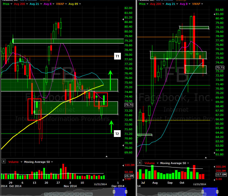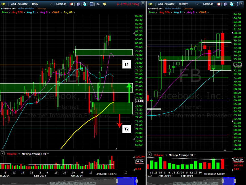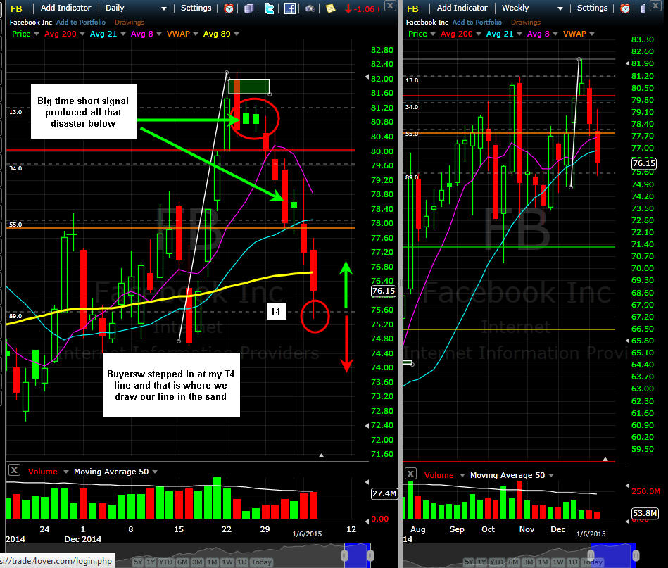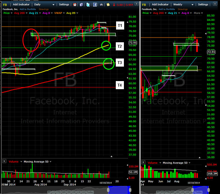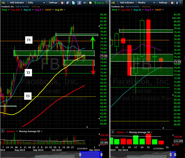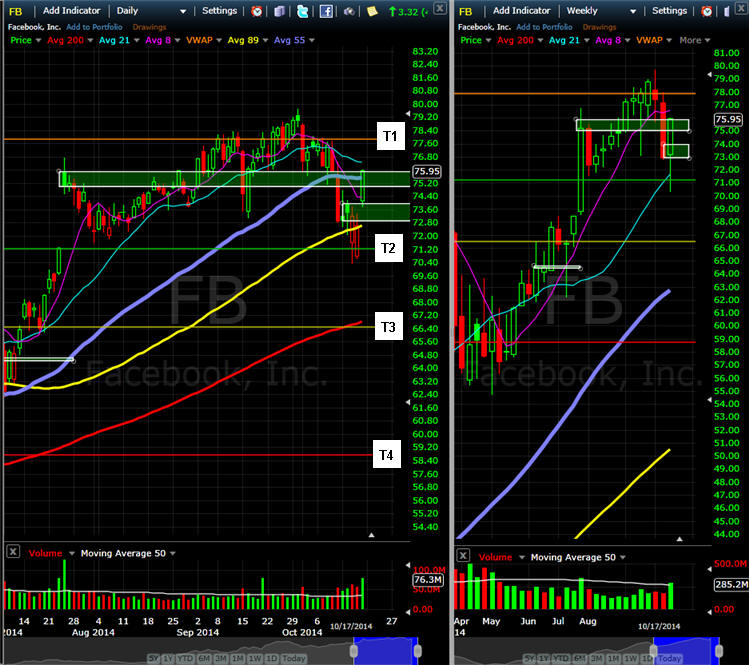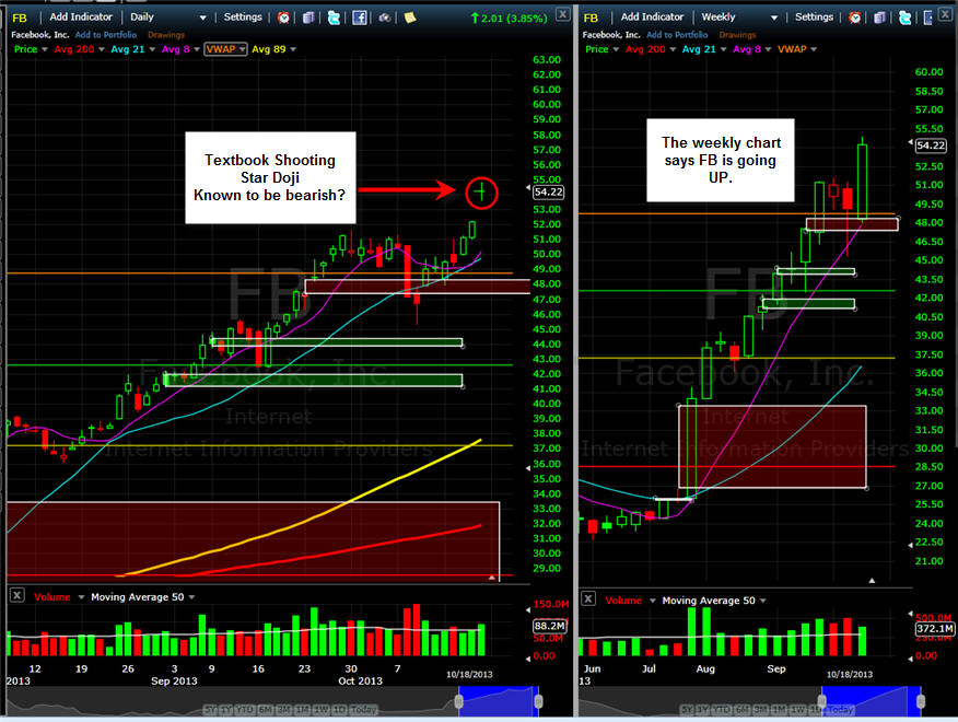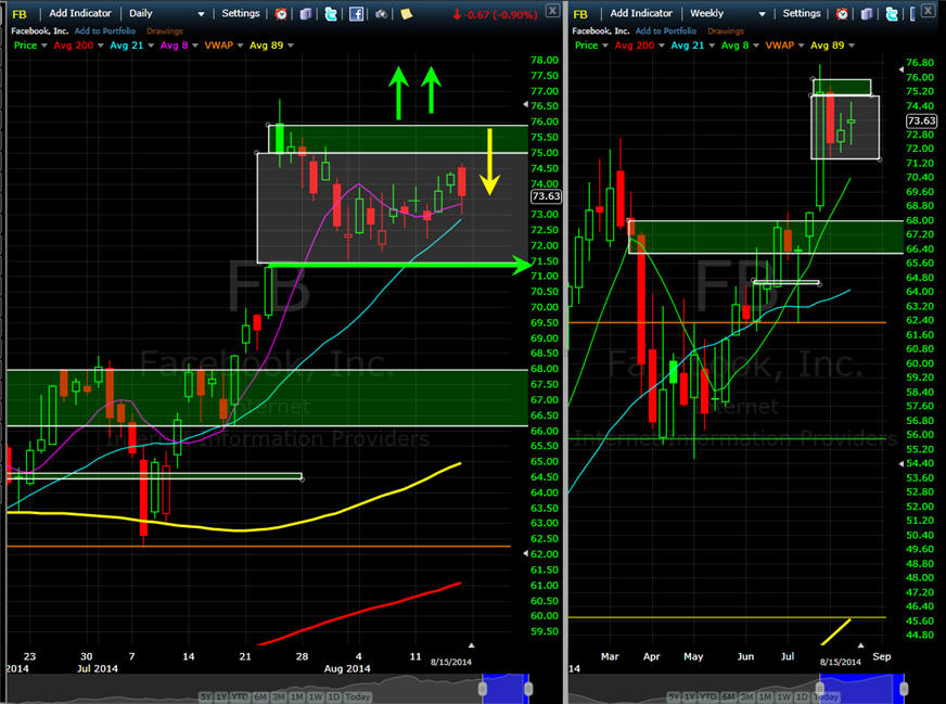 ============================================================================================= 7/10/13 - I see FB is coming back to life. I have not been paying any attention to it and for now I am just keeping the positions on that I have. ========================================================================================== 6/23/13 - A decent rally on Friday brought some life back into my long shares and naked puts. I am not happy the day ended as an SGB, but since it has a long bottoming tail, that may be good enough to keep the bulls interest, but until it takes out the topping tales form last week, FB is vulnerable to more selling pressure. Since I am long a lot of shares, I will sell covered calls if it fails to hold over T2 this week. The weekly chart is promising so long as FB stays above both SGB's there.