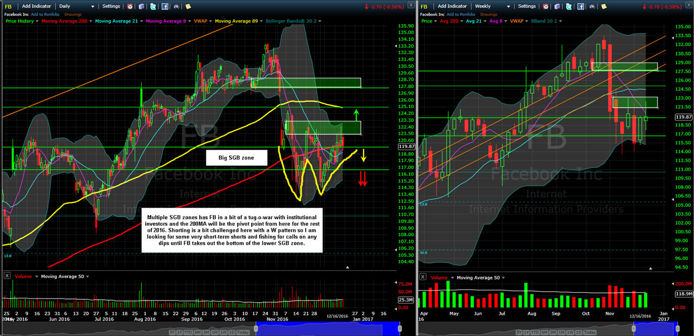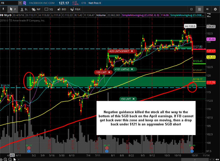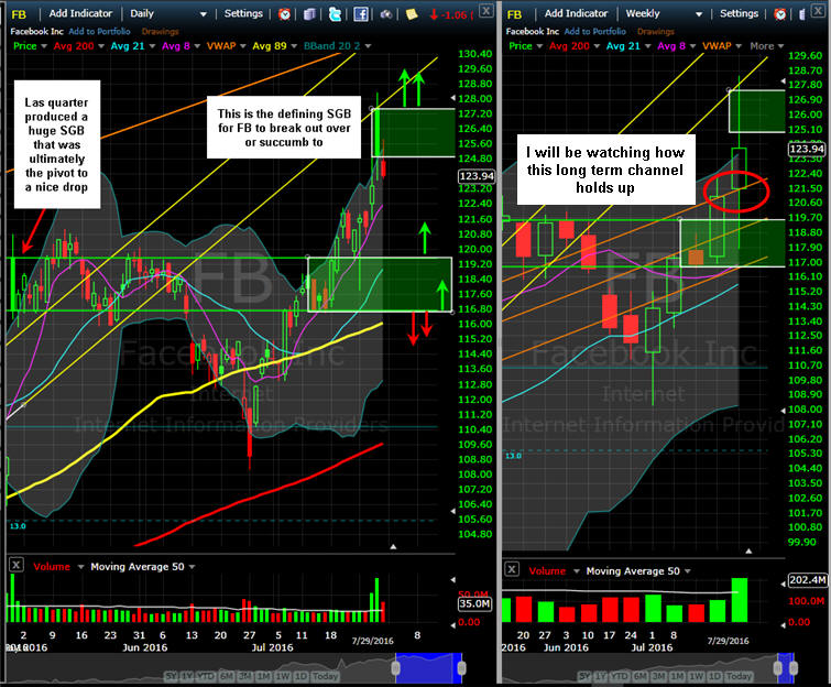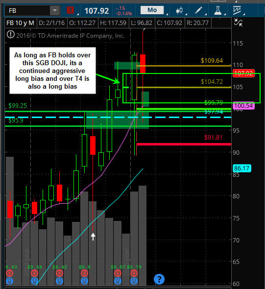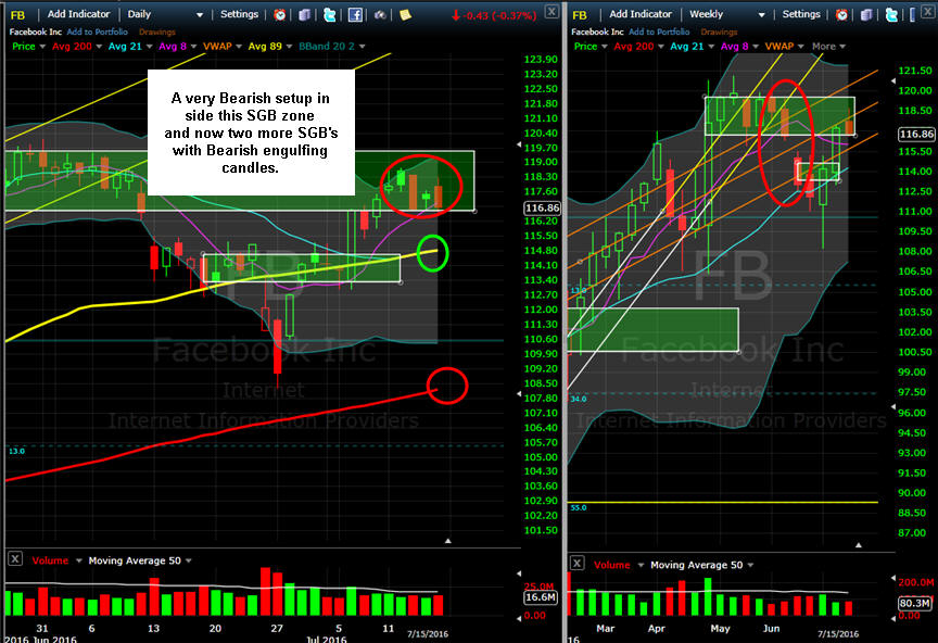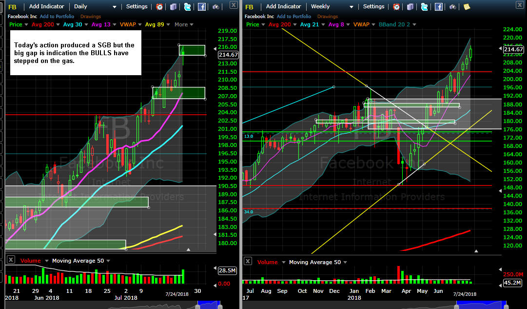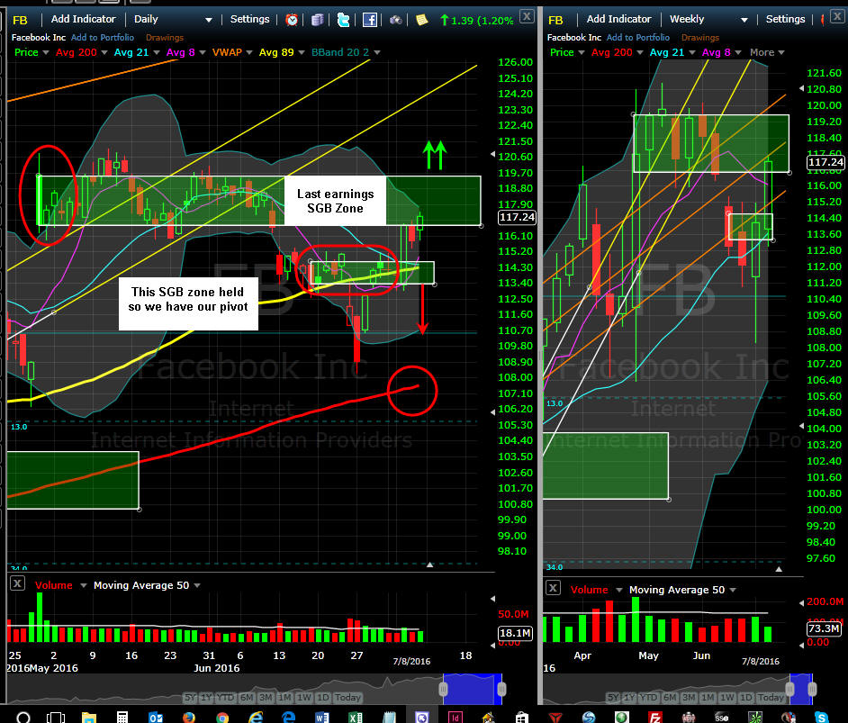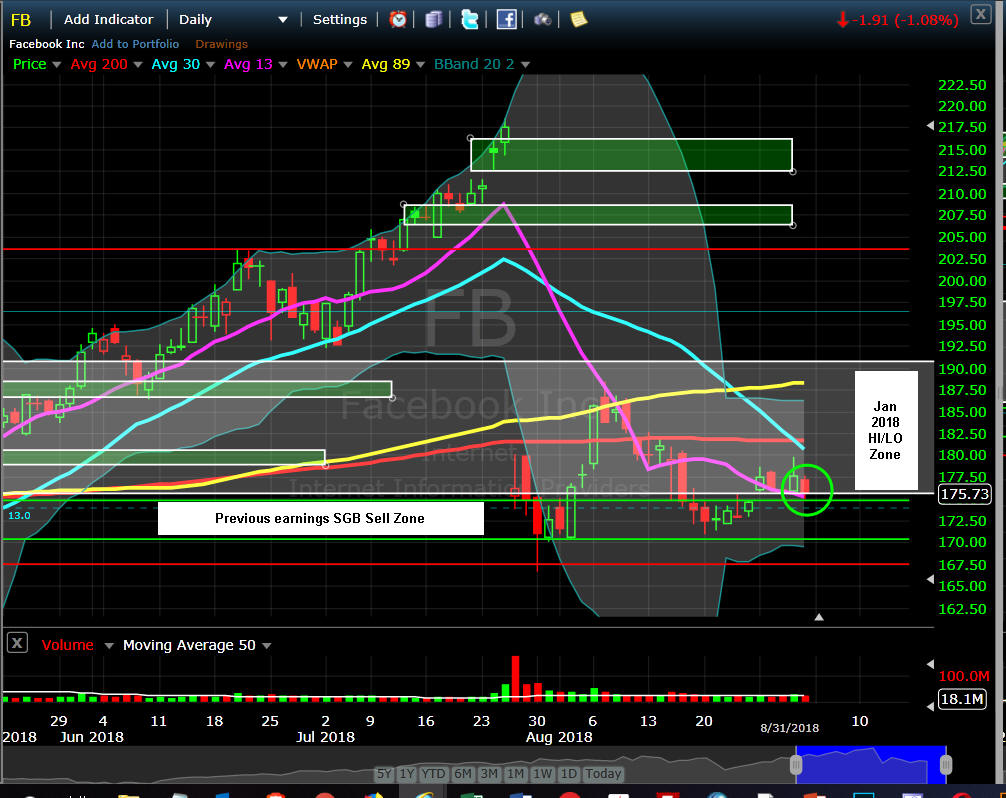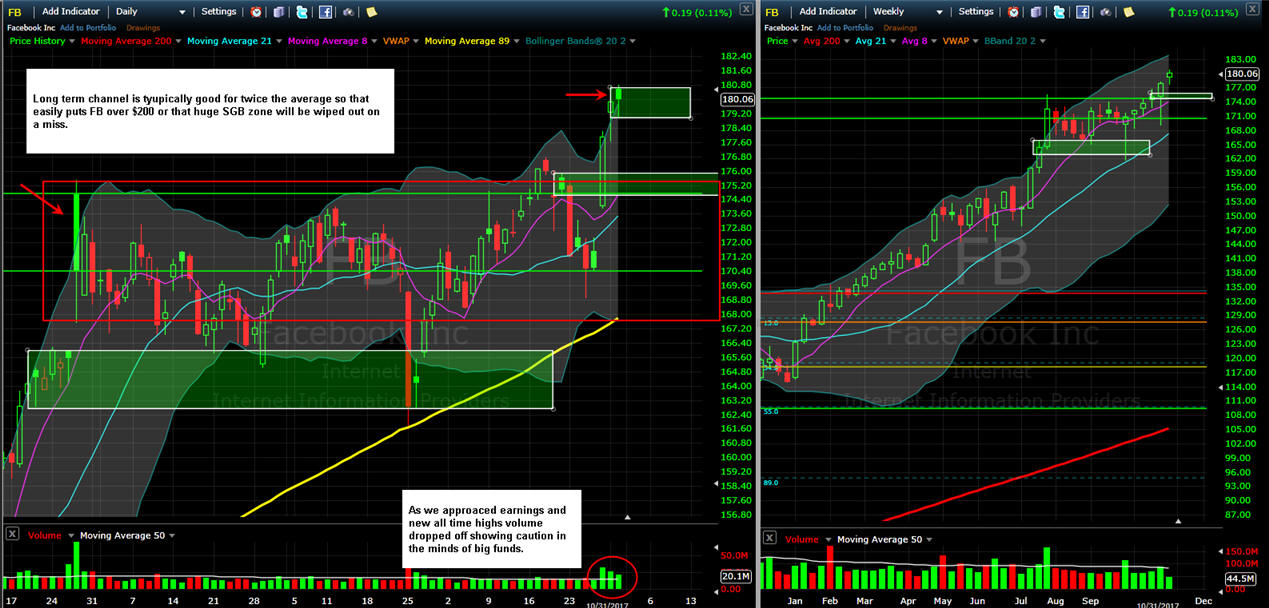 Will this be the "TOP" for the stock? No way to know, but what we can do is lay the orders and eventually we will hook up to a White Whale in the future. So, how do we figure out where the stock is going to land? That my trading friends is always a loaded question with more opinion-needles than a haystack can handle. What I can tell you, is the best haystacks are where the SGB zones show up; and that is exactly where FB stopped on Friday; so I know there is where the action or battlegrounds will be for my price/strike targets.