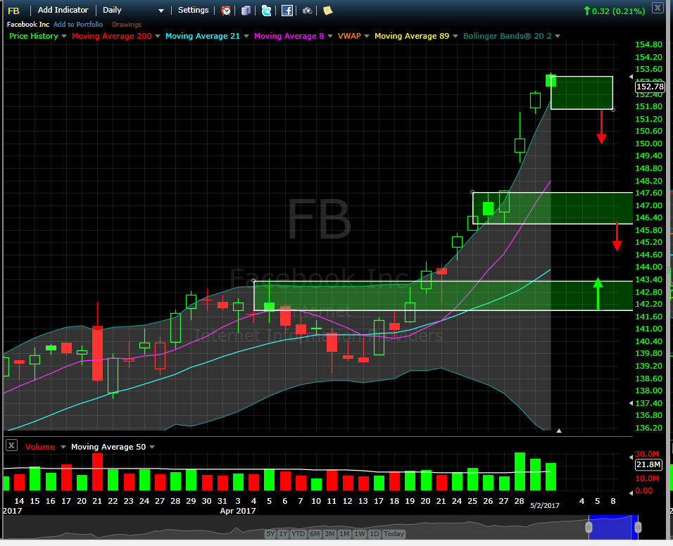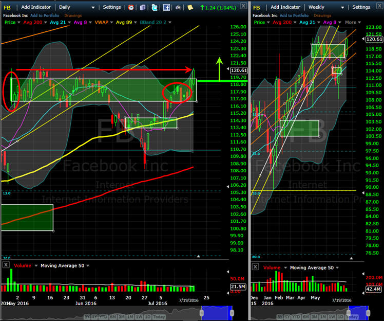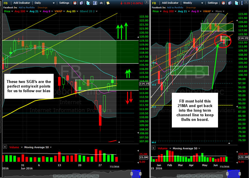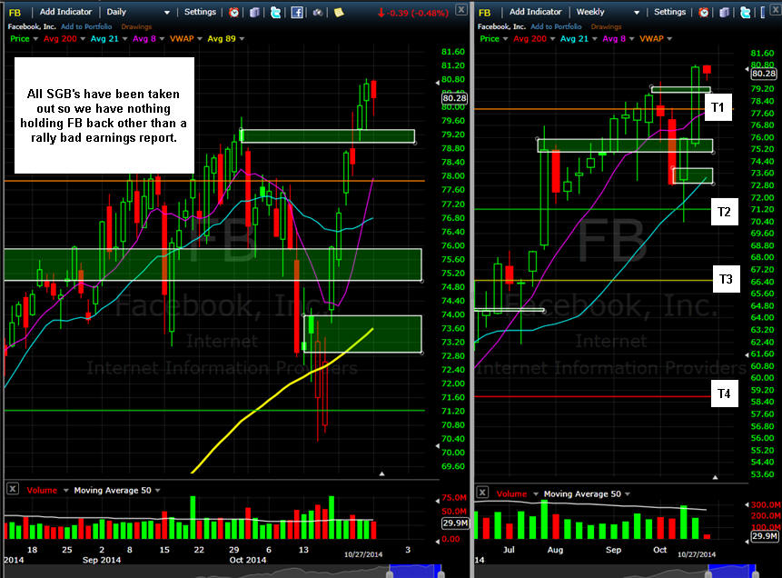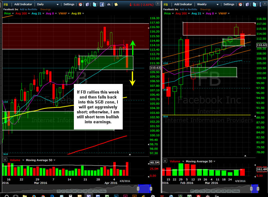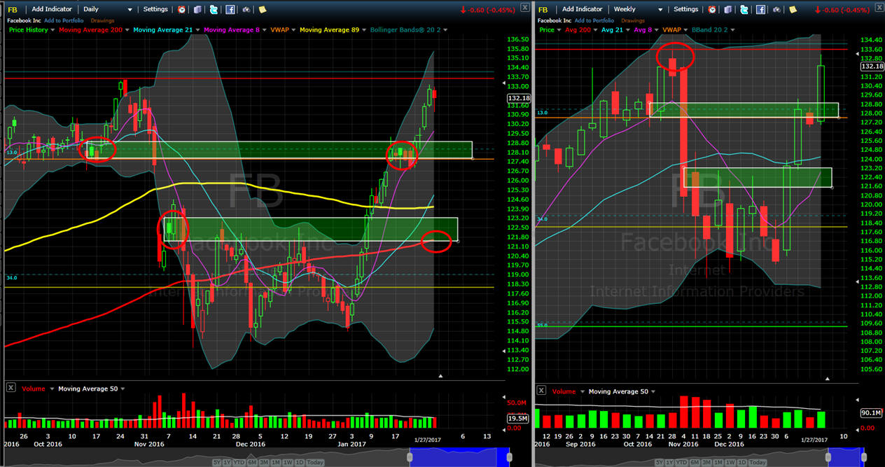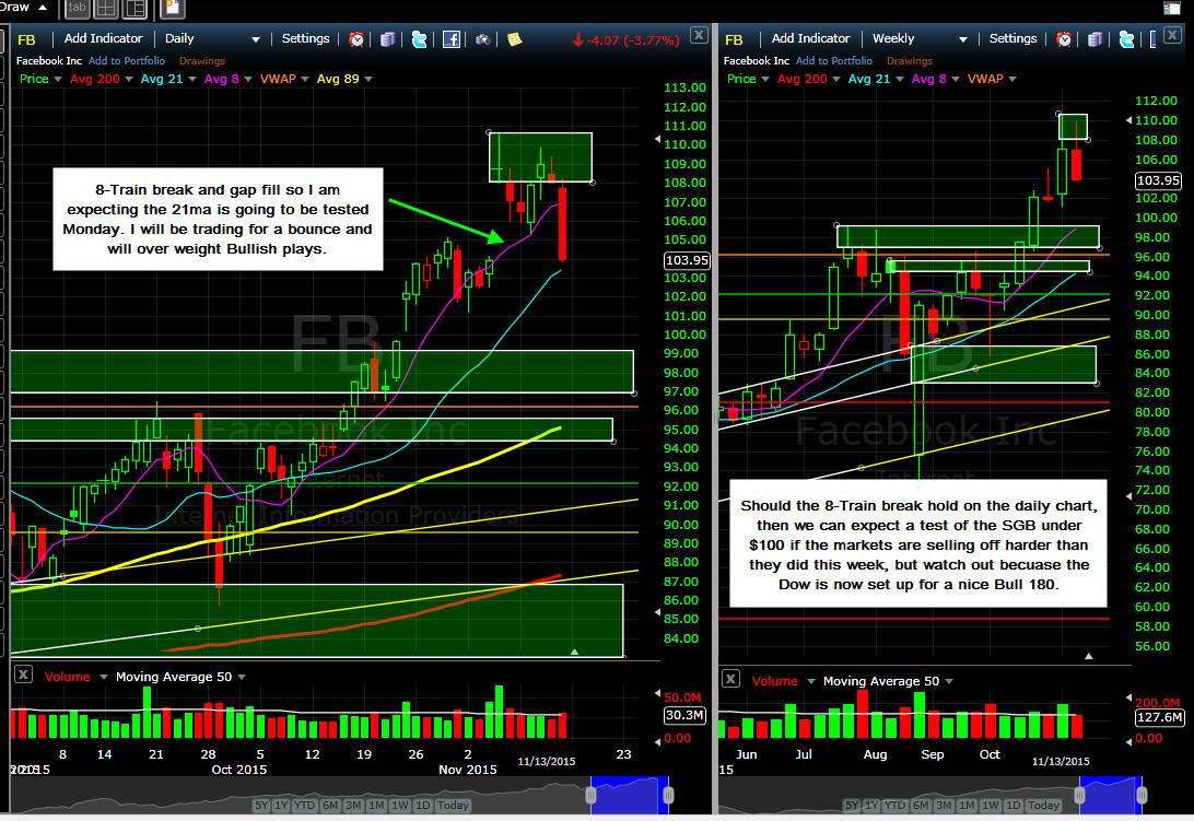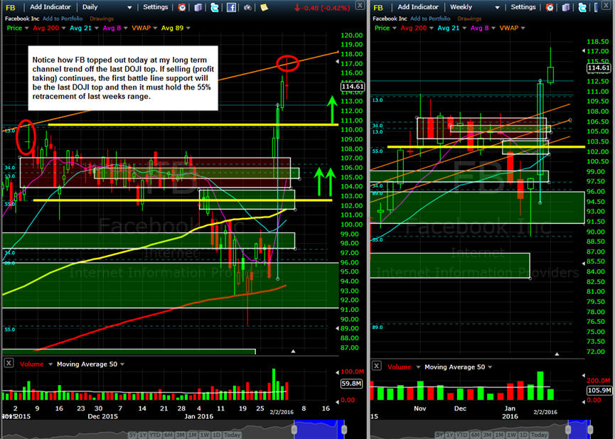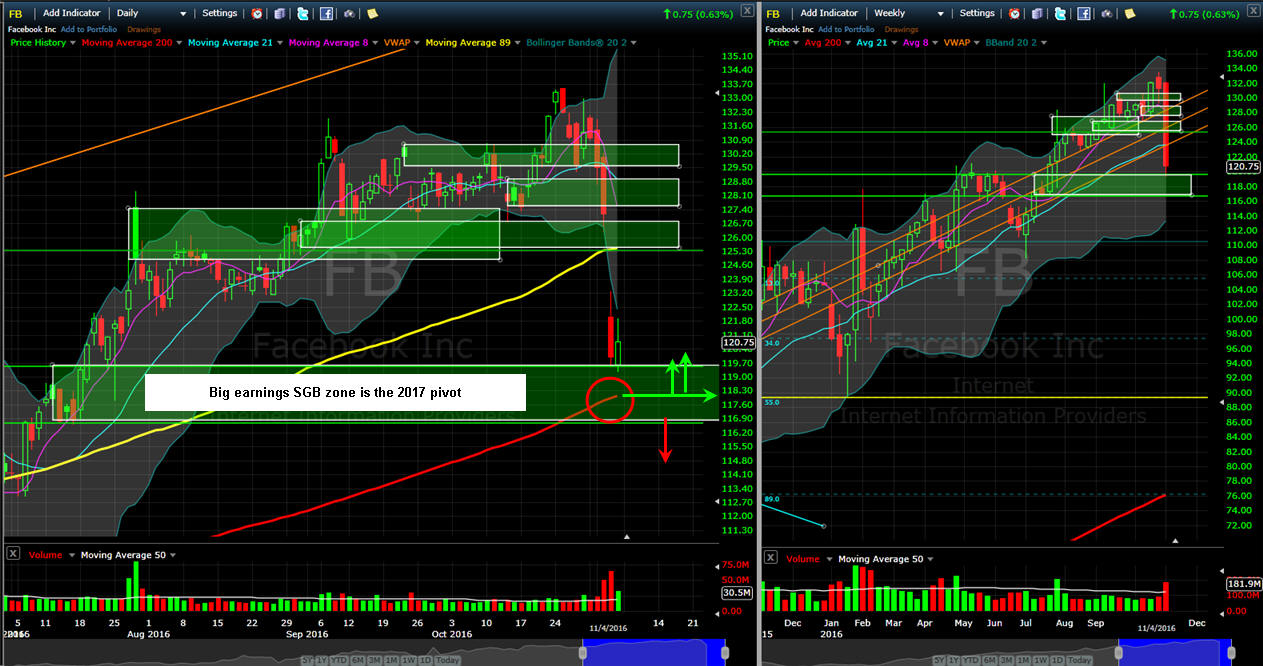 Will this be the "TOP" for the stock? No way to know, but what we can do is lay the orders and eventually we will hook up to a White Whale in the future. So, how do we figure out where the stock is going to land? That my trading friends is always a loaded question with more opinion-needles than a haystack can handle. What I can tell you, is the best haystacks are where the SGB zones show up; and that is exactly where FB stopped on Friday; so I know there is where the action or battlegrounds will be for my price/strike targets.