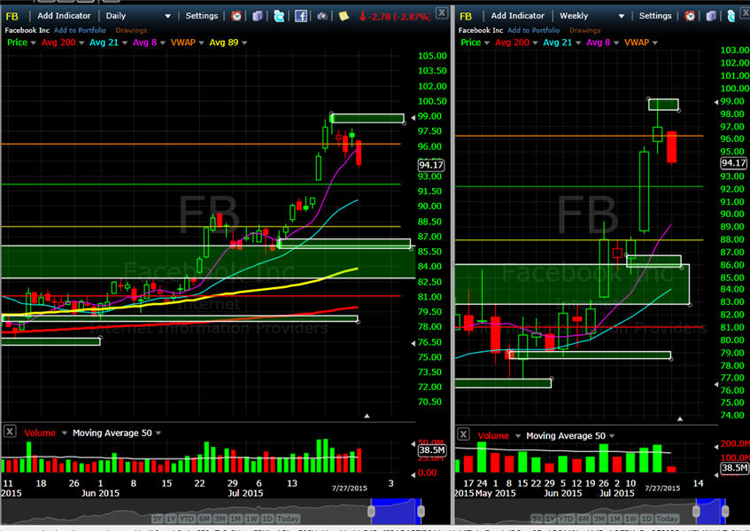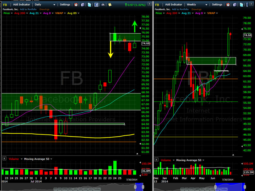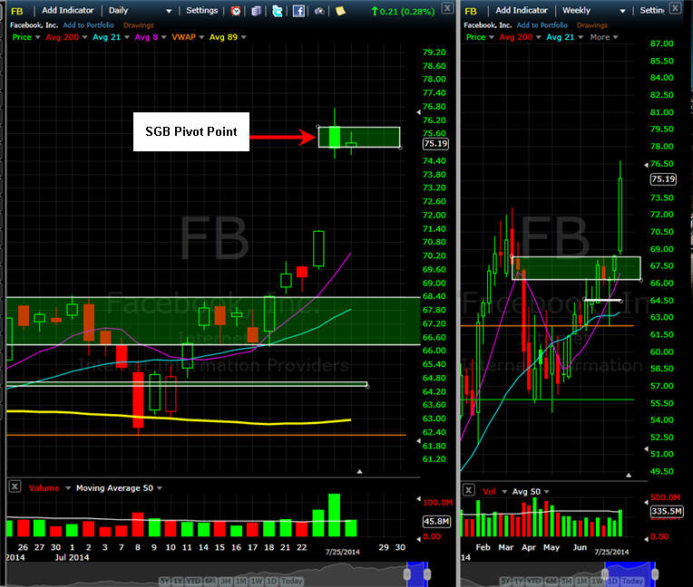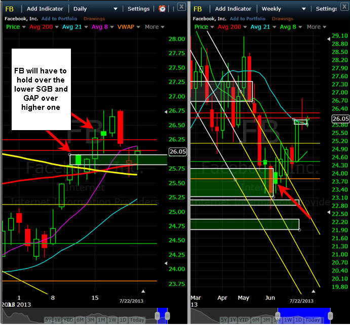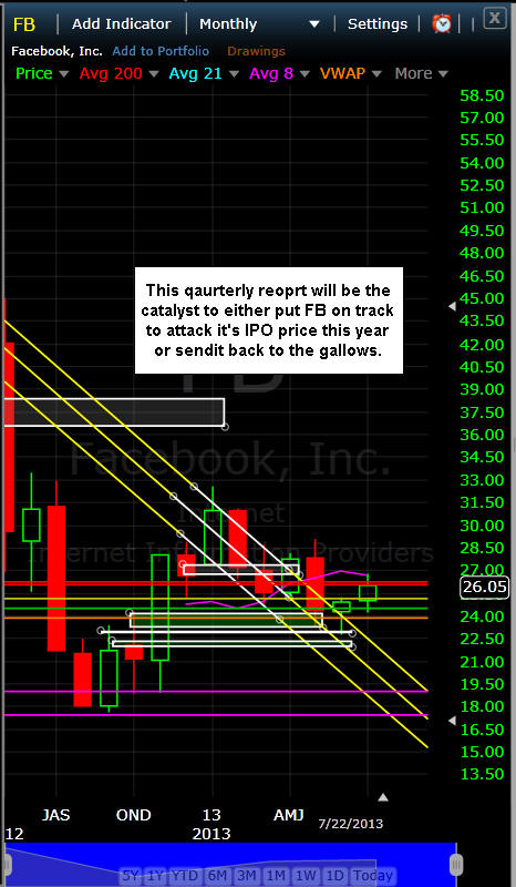 ============================================================================================= 7/22/13 - Engulfing candle and two SGB's strongly indicating FB is going down unless they have a very unexpected quarter. Then we could see some big gains in this stock. This is a love it or hate it stock right now, so pick your side or sides and see what you get. The Aug 13 calls are getting better than 2:1 volume over the puts so there is some big money betting on a blow out. The Aug 30's traded 29,000 today! That could be sellers but most likely buyers.—I am going to speculate on some of the Aug13 30 calls and 20 puts tomorrow.