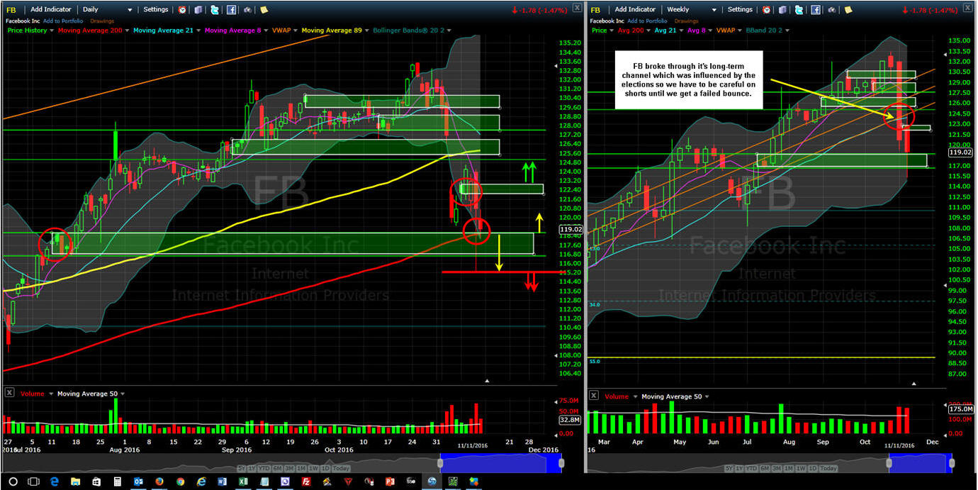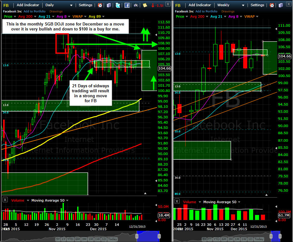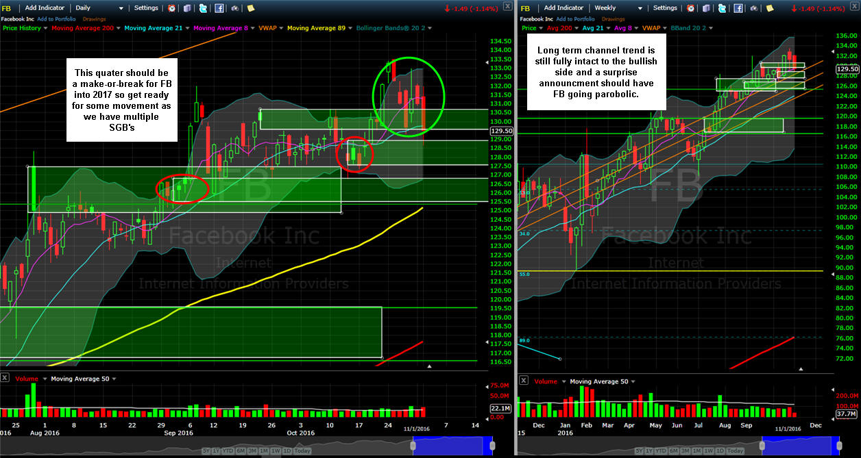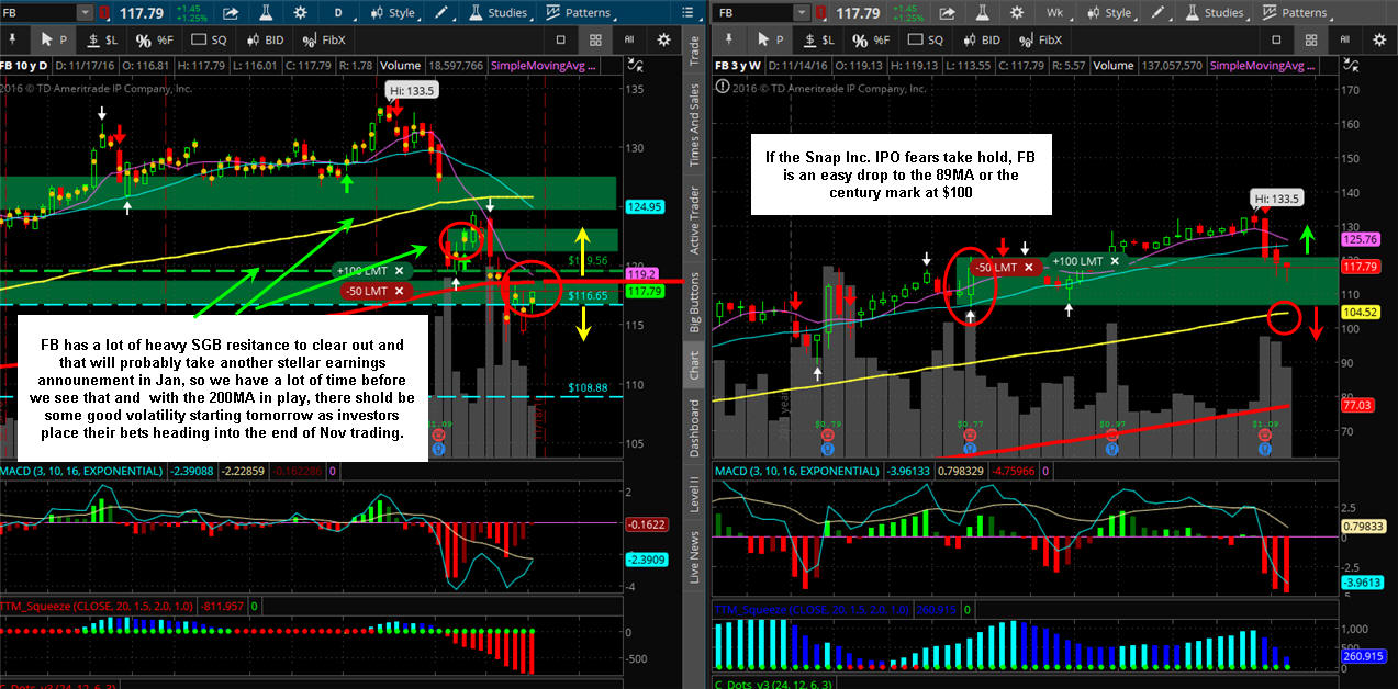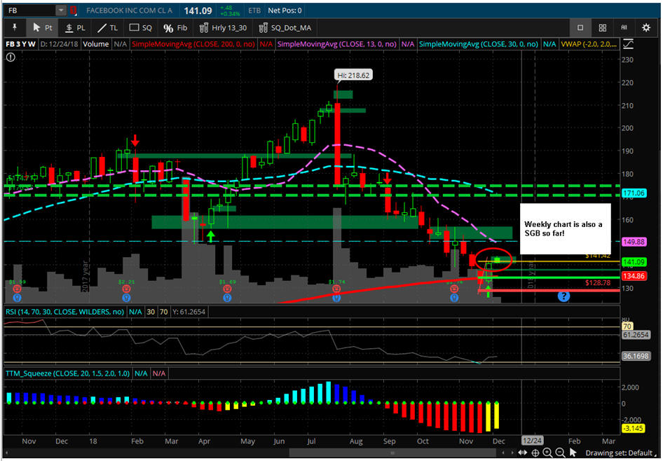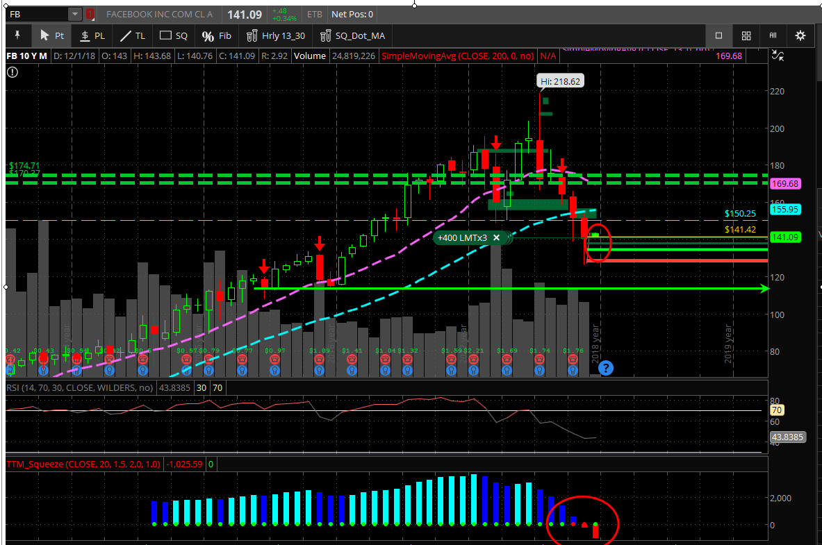 So far in December this week is starting out as a SGB!! So if the stock can get back over $150 then it could be good LONG; however, a drop from here will take out the 200MA on the monthly chart and then the freefall can come rapidly so keep wildcard LOTTO PUTS in play!!$$$!! ![]() The monthly chart has started as a SGB too with a SQUEEZE breaking to the DOWNSIDE! Here are the Lotto Trades I am placing for tomorrow on FB If FB moves back over the daily chart SGB in pre-market, then I will get long shares and adjust the PUT strikes before the open.