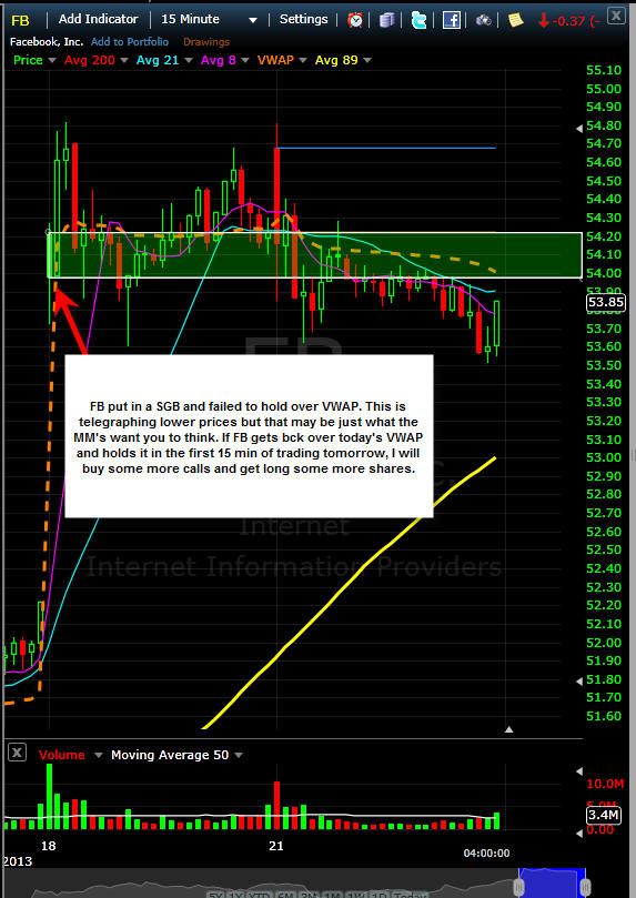5/27/13 - Under the 200MA...wow. My puts made a nice profit into the late afternoon trading, but if you did not take it, over half that profit was wiped away as FB found a bid and made a pretty decent bounce higher in the final 30 minutes of trading. There was no after ours action, so we will see what happens at the open tomorrow—I suspect FB will attempt to get back over the 200MA if the markets rally. I am managing my positions and looking for the next opportunity to get some long shares as we have a perfect Bull 180 setup in play and if FB shows me a green bar, I will get long with a strict stop below Friday's low.