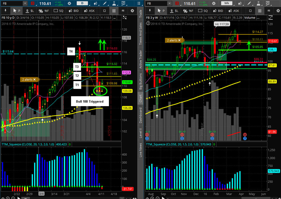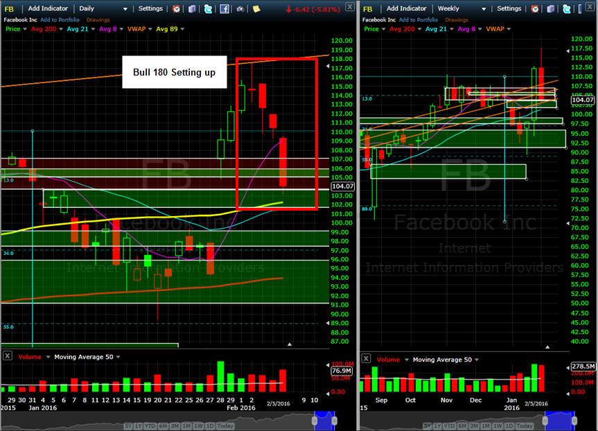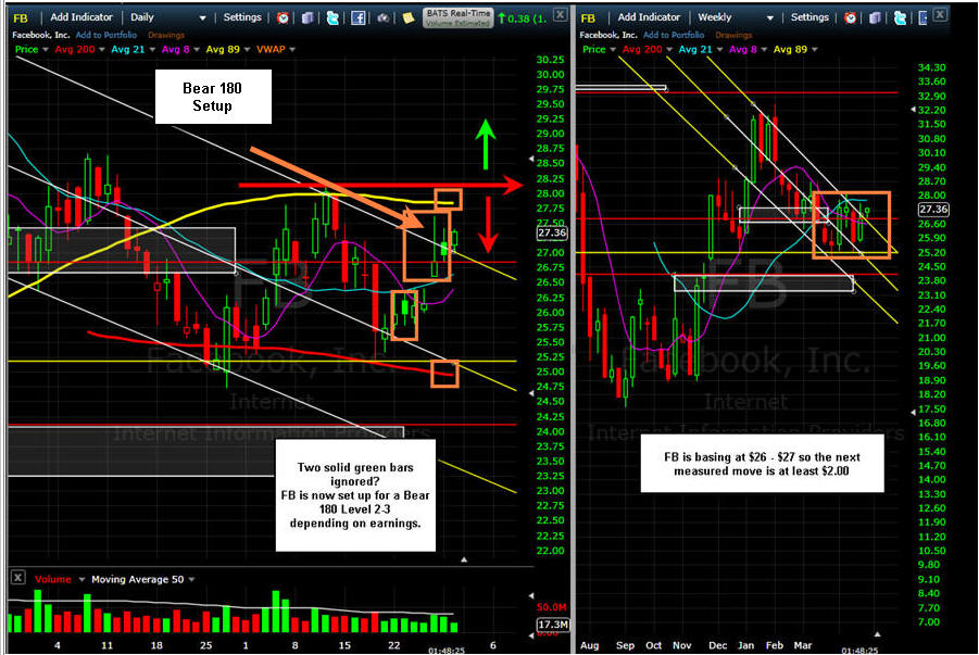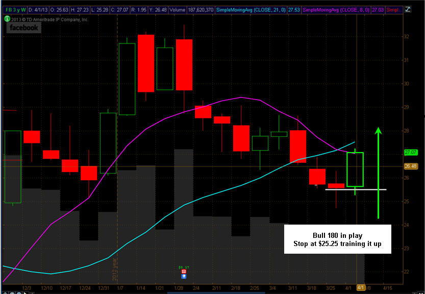 ==================================================================================== 4/3/13 - FB is attempting to rise off the weekly Bull 180 setup. This particular set up is not a textbook play, but if FB can get over $26.50 then I would be looking for it to move up to $29.00 now that target 1 has been taken out.