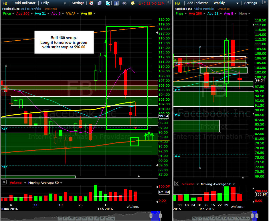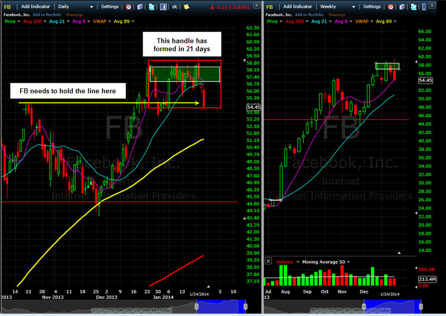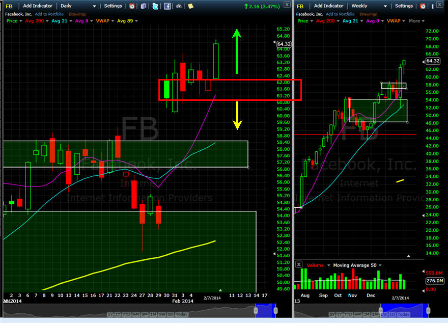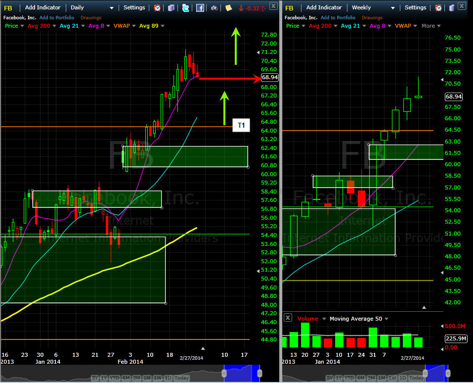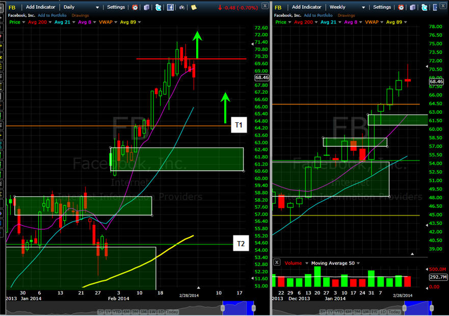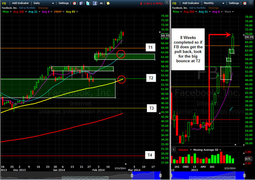 2/21/13 - Today almost started a fire sale and FB is looking like its still on sale. I was hopeful it would be a rotation winner, but so far, it's not looking good. I am now looking for a drop back to the daily 100MA. I do not expect it to make any moves higher tomorrow, but anything can happen when markets trade at all time highs. There is a lot of confusion and what if's so you have to be ready to act fast if you are a day trader. If not, then pick your spots and buy more time.
