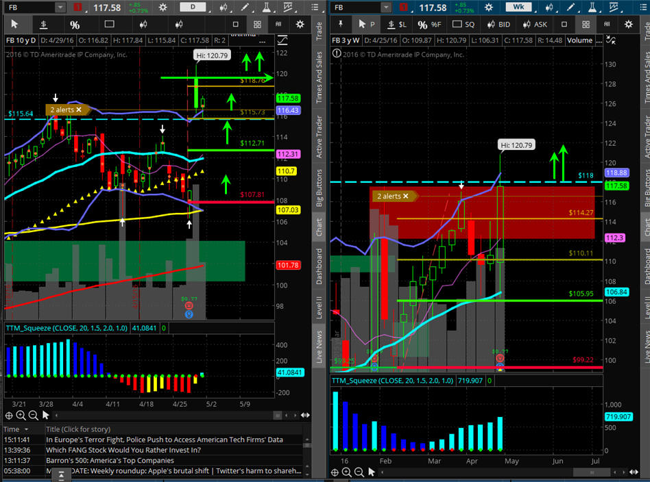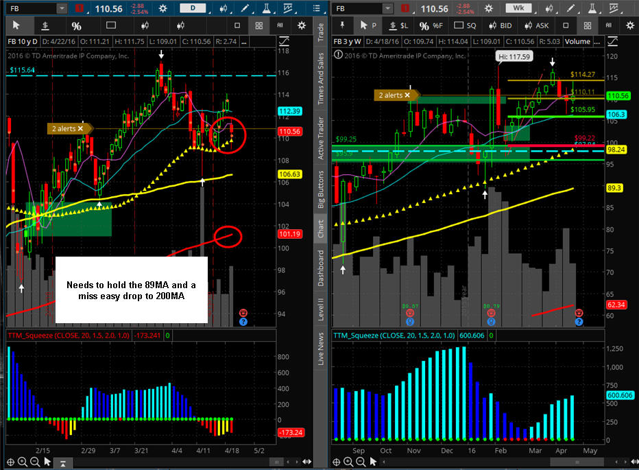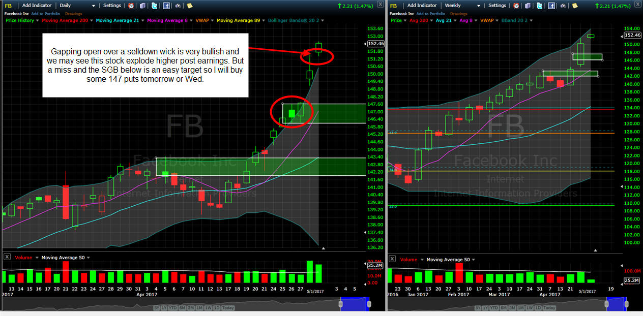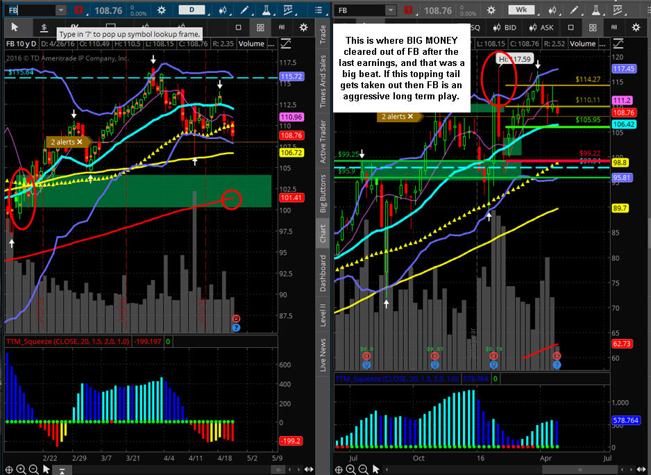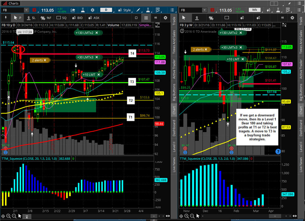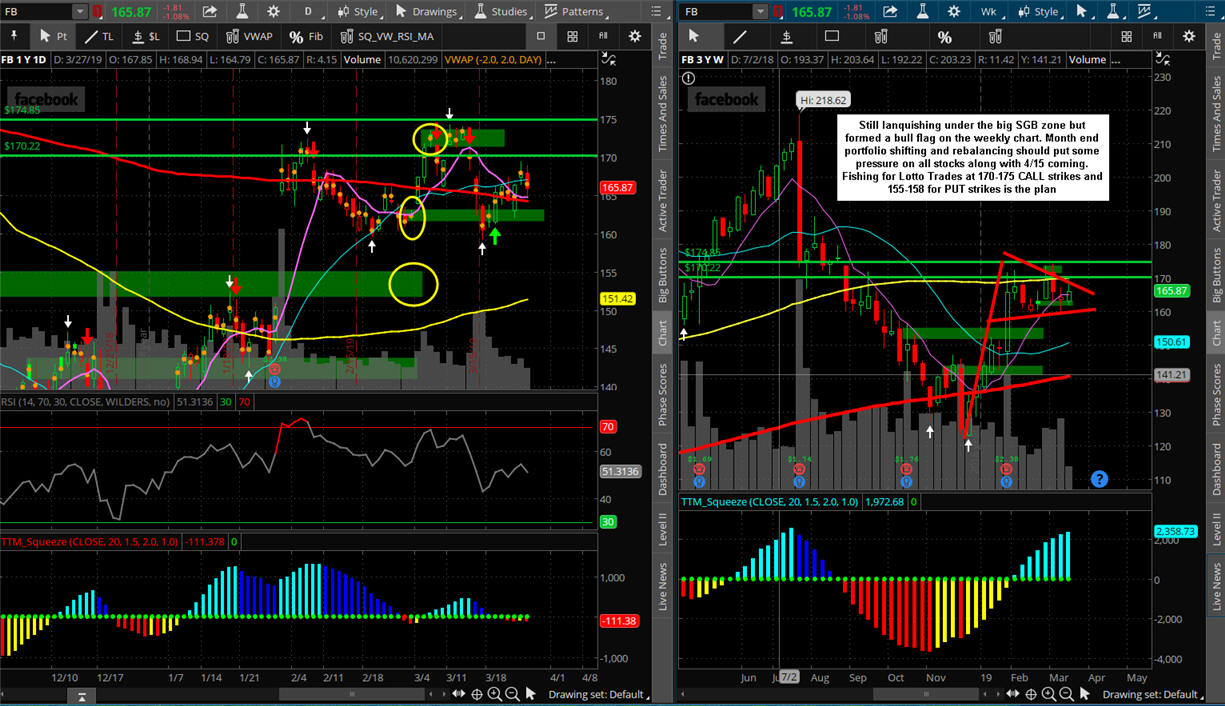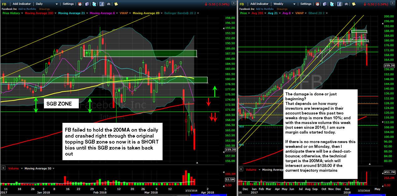 Bias is still very Bullish I will be watching Time and Sales each day for clues of institutional buys/sells. ========================================================================================================================================= 3/27/18 - FB CEO Mark Zuckerberg is going to testify before Congress on Tuesday; which should set the pace for the stock for the rest of this year. If he wins over the gang on the hill, then he will have accomplished two things. Approval as an influential man of politics which could gain cult status with his tens of millions of users. If he flubs the gig, and they gang up on him with regulation, then FB users may just drop him, and his company which means advertising revenue will plummet and so will the stocks price! Either way, we should see some solid moves this week, so getting in and fishing for low entry points is a pretty good bet this week. Also, with earnings coming, if things go bad there too, we could see this stock literally get cut in half!—the biggest question is will FB users begin to decide if FB is a Friend or Foe with their data, privacy and use of the information they put on the network. The daily and weekly chart both have SGB's so we are in for some action this week and into earnings!$!$!$ I am buying some wildcard Lotto Trades 15% OTM on calls and puts, then fish $0.20 on 5% OTM calls and puts this week—there is a Moby Dick Lotto Trade in the water here!!!