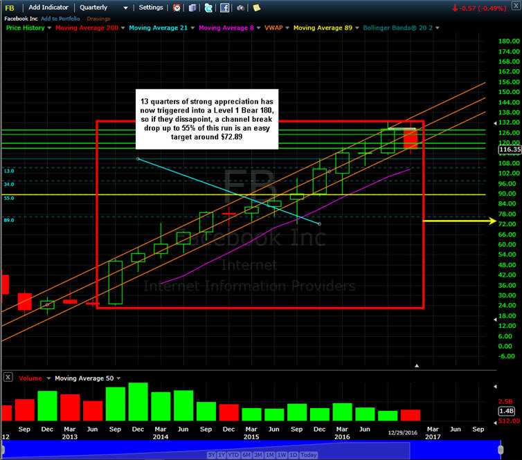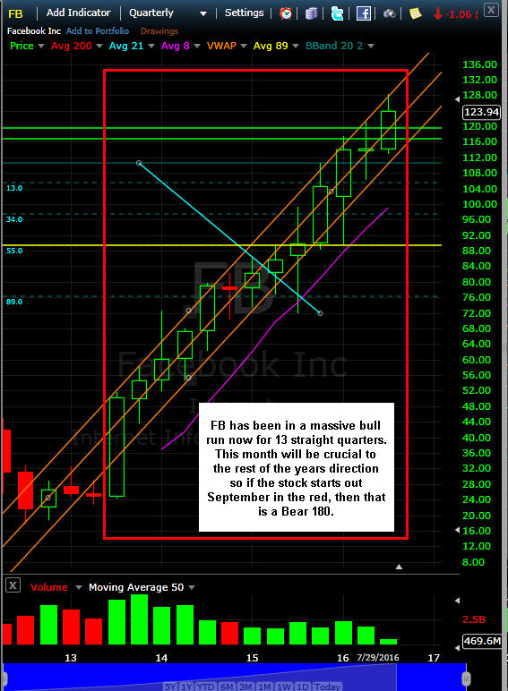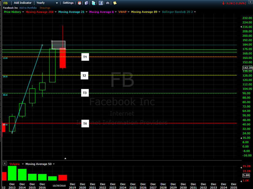 ========================================================================================= 10/27/18 - Tomorrow is FB earnings after the bell and it should be a mover the rest of the week. This stock was whacked last quarter on a revenue miss, slower-than-expected user growth and forced spending to appease government scrutiny; which gave us a missive Moby Dick Lotto Trade on the 190 Puts; and this quarter could be the nail-in-the-coffin or a massive explosion of upside back to those all time highs...at least that is what investors and speculators hope to see happen. This stock has been a very difficult one to trade at earnings in the early years even on good news; however, I am still anticipating a big move in either direction. Ever since the government scrutiny scandal, this stock has not had any relief of negative impacting news, so that has kept a steady decline in the stock price. Over the past few months, there has been disinformation campaigns, hacking of 50-million accounts and ramblings that CEO Mark Zuckerberg has too much power over the company and should follow the in the footsteps of MSFT, GOOGL, ORCL founders and step aside from both roles of CEO and COB. Yeah right! He controls 60% of the voting shares; therefore, he would have to ax himself...and that just isn't going to happen if the portrayal of him in the Social Network movie was accurate—he's the CEO Beeaatch! The bottom line is the stock will keep on sliding or dropping lower if they do not post a surprise quarter and if they report a negative quarter, the drop could easily be 20+% so I am looking at wild card PUT strikes and CALL strikes at the overhead SGB zone at $170 from the July 2017 quarter. The downside 200MA on the weekly chart is at $132.00 and on the Monthly chart the next support is at $115-120. I was looking at a Yearly chart and noticed that FB is in a 5-year triggered Bear 180 which could see the stock drop back to T3 which is under $100 per share!