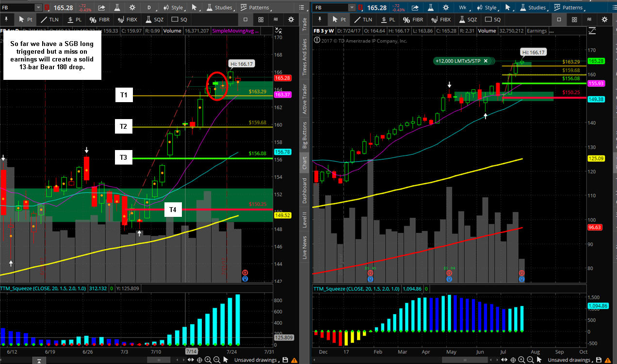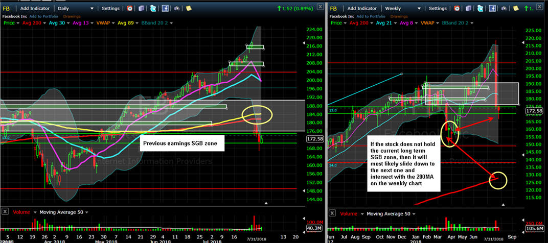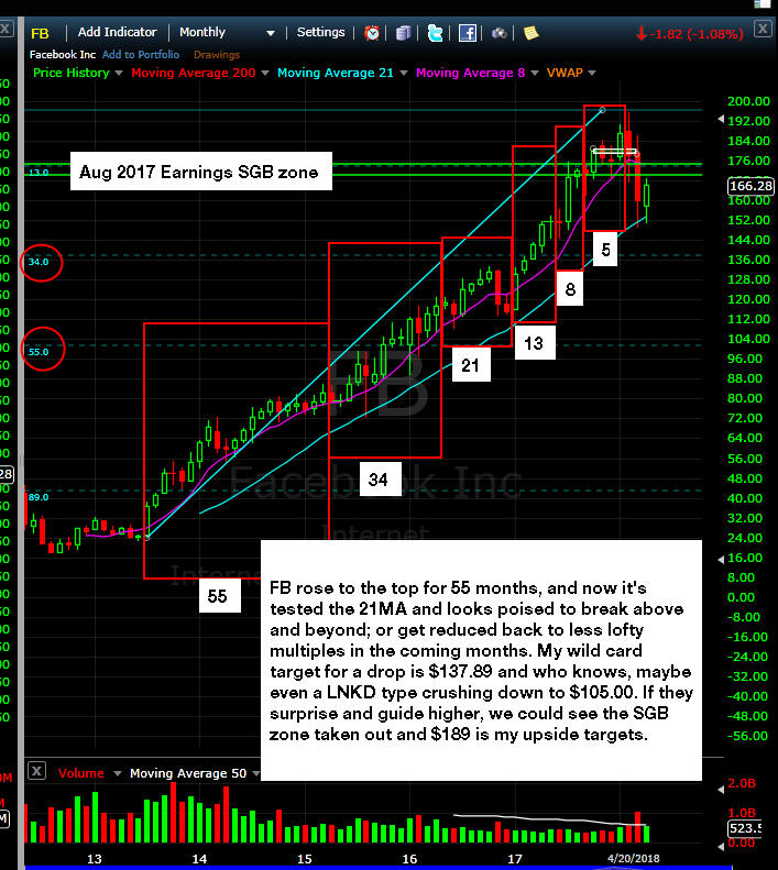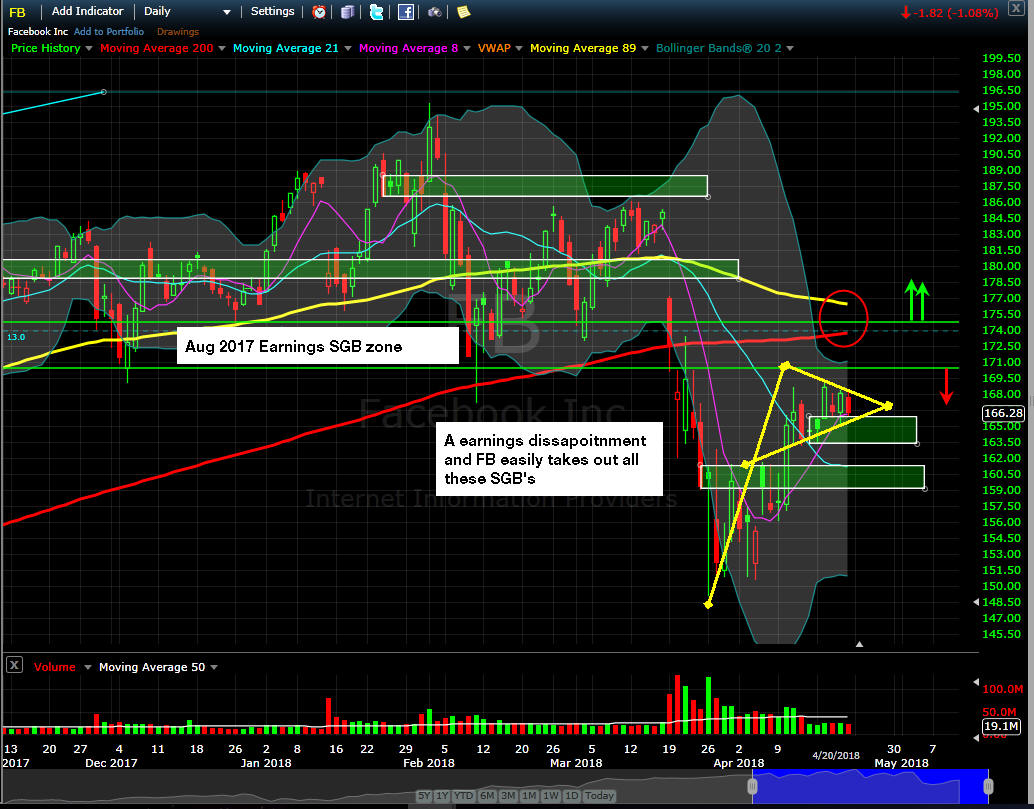 ===================================================================================== 4/22/18 - We have a potential White Whale Trade with FB earnings this week! Will they surprise and keep the faith of institutional investors, of has the cat been let out of the bag on how they actually SPY on everyone and use that data to manipulate their users? Well, that depends on how their subscribers interpret manipulation—and that is a loaded question. The bottom line here is THE BOTTOM LINE with institutional investors. If it is perceived the coming changes in FB privacy policy will give too much control for users to opt out (and it should!), then the company will assuredly suffer their ability for "targeting" user interests; which is exactly what is making them soooooo successful with advertisers. If an advertiser cannot get drilled down analytics on users interest, then they will definitely slow down the spending for the a-typical CPC (cost-per-click) model like GOOGL uses. Being able to pinpoint a users interests, preferences and habits is a critical component for FB advertisers; and if the company does not figure out a way to make that a need of their users in lieu of giving up privacy, then you can expect ad revenues to drop...and so will the stock...BIG TIME!—especially when government regulations kick in! On the other hand, if we get the usual apathetic response from FB users (most likely since the majority are addicted to the site), then it's probably full steam ahead on a beat; however, I think it will take a couple of quarters to determine if the coming changes will have significant impact on advertising revenue; which can easily stifle large institutional investing and stagnate the stocks continued rise for months. Looking over the stocks performance since the scandals broke out, we have three SGB's in play; and with the stock setting up a Bull Flag under under the Aug 2017 earnings SGB zone we could easily get some momentum going. Over the years, I have had hit-n-miss trades with FB earnings plays, so it's a challenge for me to put big money on any trades; therefore, I am looking for a Wild Card Lotto Trade this time with PUT strikes at 15% OTM and CALL strikes at 10% OTM.