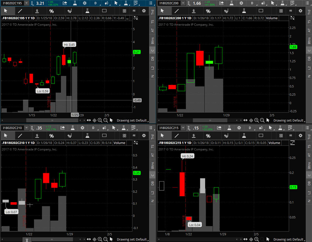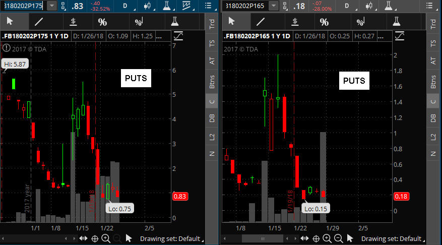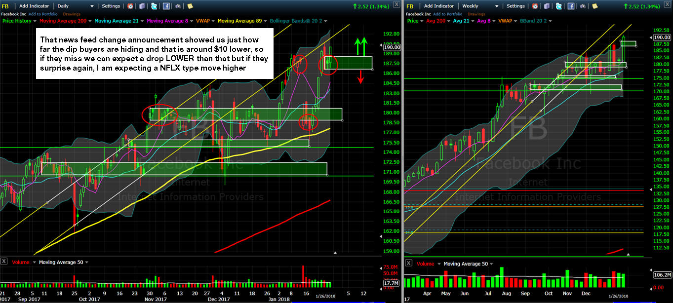 ================================================================================================================================= 1/28/18 - FB is approaching a milestone for the social media giant with $200 in the strike zone. If they have yet another earnings surprise, we could possibly see a NFLX type reaction since this stock is trading cheap in price point but still trading at high multiples. In the past, FB has beat and even surprised estimates, but the stock has traded flat. Will this be a different scenario this time? If you look at the past couple of weeks, we can see the stock has been extremely volatile with movements upwards and downwards some $14 dollars in both directions. The biggest single day moves have been around $7 per share so the multi-day moves have been double that; however, a couple weeks back when CEO Mark Zuckerberg announced they were changing the metrics of the News Feed, the stock was initially whacked $10 overnight, but managed a strong comeback as investors looked at that as a GIFT buying opportunity. All charts point to a massive higher parabolic move, but that will take a stellar report and strong guidance which is something FB has not done too heavily in the past—the would rather under promise and over deliver like AAPL and others have. Ok, so we have to keep fishing for entry prices this week since earnings are not until the 31st, but I am definitely going to have my Lotto Calls and Wildcard trades in play; then do some WW fishing post earnings and hope for a NFLX type move!! The current IV is 58% which is relatively low for this stock heading into earnings which means a surprise could create a nice multi-day squeeze, but most the time, FB does not trade much higher than the MMM which is at +/- 10.00 at this time. With that being said, DO NOT LOAD THE BOAT on this stock; however, FISH for decent size with multiple orders and see what you can get filled on. Ok, I am starting my fishing trips up to 15% OTM on calls this week and depending oh how FB moves Monday, I will adjust my strikes accordingly by Wednesday. Here are the PUT strikes I am currently watching and will adjust higher if FB moves up on Monday. Calls (bullish sentiment) is VERY high so a big miss and we can see a much larger drop than we got just off the News Feed changes, but that is most likely not going to be the case; however, a couple years back when LNKD missed, the stock was cut dang near in half so have your wildcard puts (up to 20% OTM) in place because they should be cheap to buy.