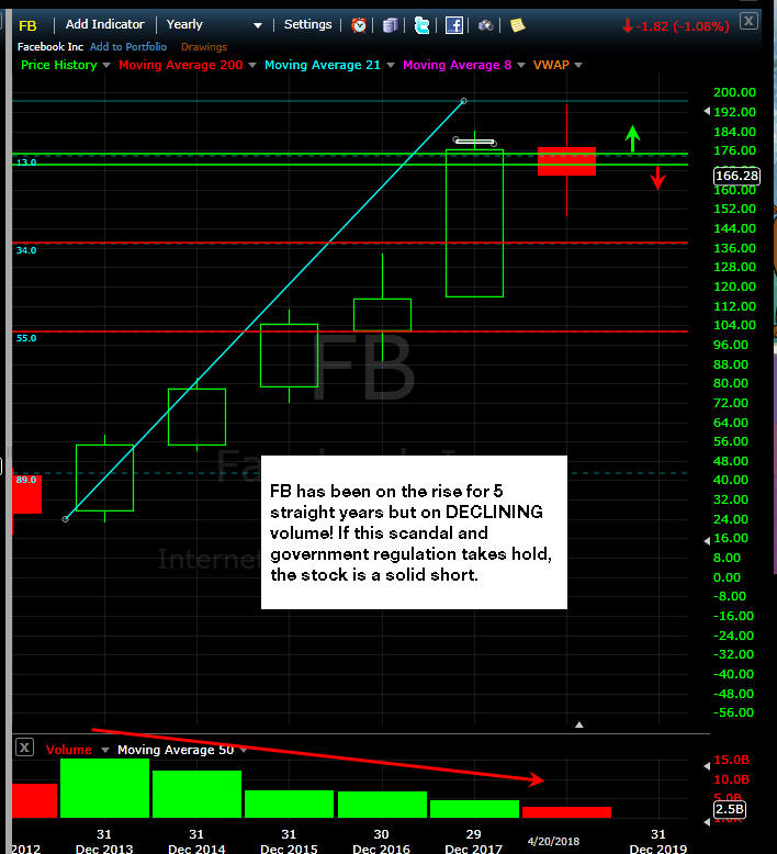 ========================================================================================== 3/27/18 - Another round of selling hit the markets today and FB was dumped on strong volume after yesterdays hanging man SGB failed to hold the line. The news confirmed that CEO Zuckerberg will testify before the US Congress, so we should see continued selling pressure on the stock until that event happens. I am sure it will be the usual mumbo-jumbo with intelligent things like, "uh umm, I don't remember" or "I would never let that happen" oh and brilliant replies like, "I will have to investigate that senator and get back to you for the record (wink wink). I am sure this up and coming media circus is going to be a Ringling Brothers worthy show as the clowns of congress come out to ruffle their feathers about the evil doings of FB getting the President single handedly elected with their meddling...blah blah PUKE! Bottom line, if FB fails to make the grade with them thar purveyors of truth, just-us and the American get-outta-my-way law(less) makers, then I expect a crushing of the stocks price as unsuspecting users of FB disembark from their favorite online hangout spot as they are woken up to what is really going on at the company with their personal data, texts, messaging, phones calls, habits, friends lists etc. But really, would something like this be a massive deal killer for them and the stocks prices? Uh, yeah, it certainly could if the talking heads chime in and paint a very intrusive, ugly picture of the company and their practices—after all, you may remember that Zuckerberg has been quoted saying his users are "dumb fu**s" for trusting him with their data back in early 2004. It's all going to be interesting to see how FB moves; and we need to be ready to profit; so my plan is to fish puts up to 20% OTM and calls up to 10% OTM plus I will buy some wildcard lotto puts all month until earnings come out on the 25th.