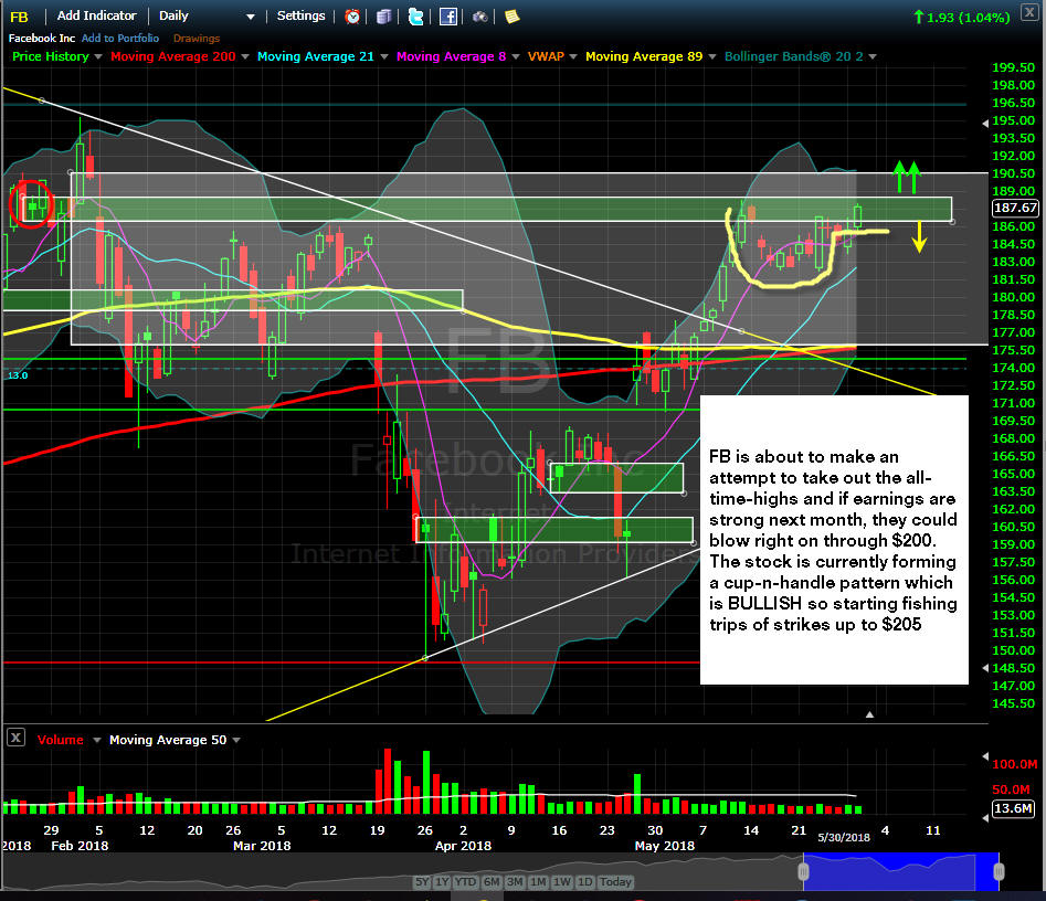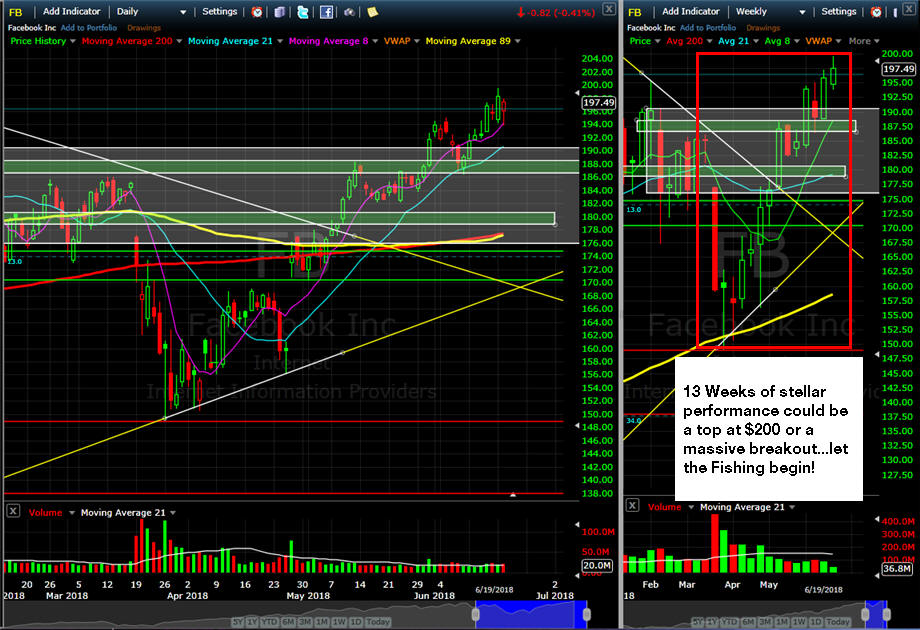================================================================================================= 6/19/18 - FB was just a few cents away from taking out $200 yesterday; and if today's action is any indication in light of the trade wars sell off, we could see FB push right through $200 this week, so I am buying some Lotto Calls tomorrow; and will get some more for next week on Friday. It appears the companies privacy scandals have been abated and they are moving on full steam ahead. What I am noticing is the institutional ownership stats are lower and we definitely need that money to propel this stock higher so if they do come out with stellar earnings we could see a stampede; therefore, I am continuing to buy Lotto Calls week-to-week, but I want to start fishing for Lotto Puts at earnings time. Looking over the charts, I see this is the 13th week since the stock bottomed off the privacy scandal news; and volume has steadily declined too, so it is going to take a catalyst to bust a move over the $200 price milestone. Therefore, I am sticking to my plan looking for SGB's as that will be the tall tail sign of big money moving in or out of this stock. Over the years, FB has been a bit of a difficult stock to trade with short term weekly options because it does not move too high in short bursts, but it can climb the mountain over time, so picking up a few longer term plays is a good bet and I would look for DoubleUP! trades to finance your Lotto Trades!