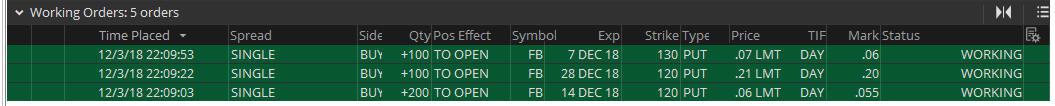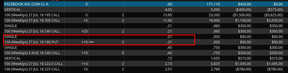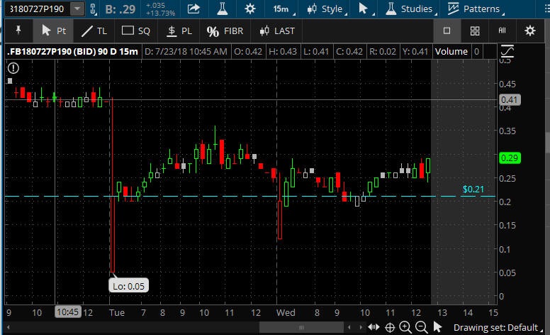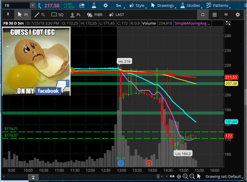 ==================================================================================================== 7/25/18 - FB CRUSHED!!!!! They missed on revenue and then GUIDED DOWN which is crushing the stock. Question is, will this hold up into the open tomorrow and we get to cash in on those 190 puts? Anybody's guess, but things are looking good so far!!! I was filled on the 190 puts at $0.21 All my trades on FB: Another thing I pointed out yesterday was the SGB; however, I too thought this one would result in a continuation—how can anyone (other than insiders) predict when management will say something that causes a massive avalanche in post market trading? If the company rebounds in the pre-market session tomorrow, I think it can climb back to around $198-199.00, so I want to fish in multiple strikes under $200 and see what I can get filled at. NOTE:Do not bet the farm on this even if you FOMO'd the 190 puts...there is ALWAYS another Lotto Trade coming!
