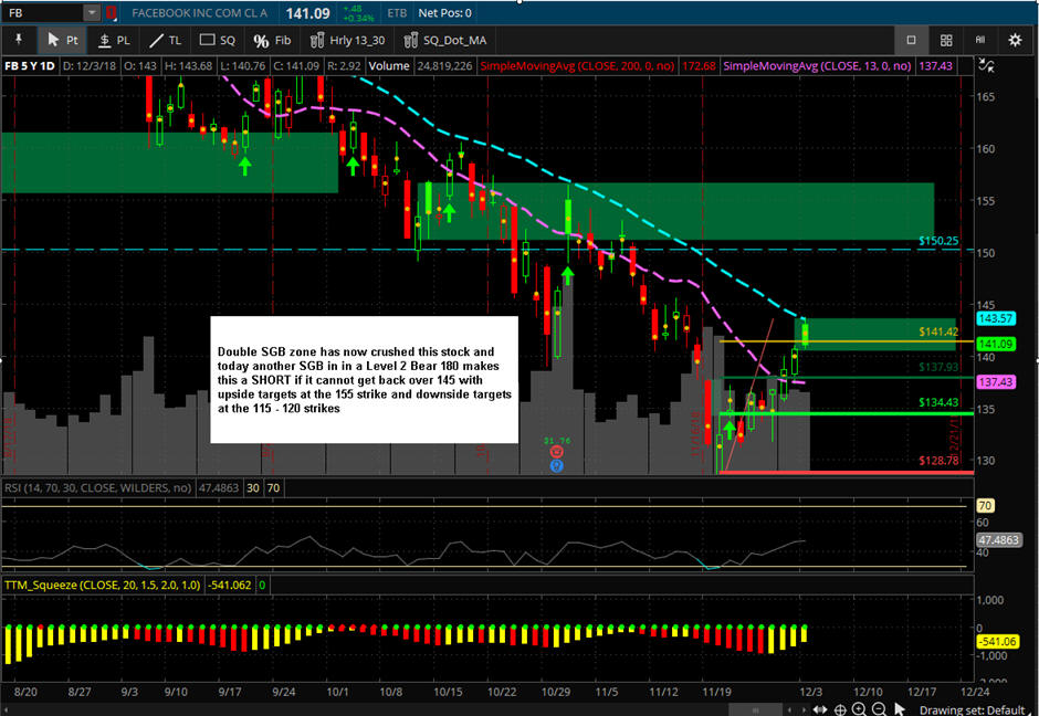 12/3/18 - More trouble on the horizon for FB and now that the dems have control of congress, you can bet there will be legislation of social media introduced into congress next year as many believe FB is a direct contributor to Trump winning the elections. Since the scandal broke, FB has been in a continuous slide and all the way down to the 200MA on the weekly chart. Today, the stock ended with another SGB and it is also a Bear 180 setup which looks to me like a Level 2. The previous earnings quarter produced a SGB in a SGB zone so now we have strong resistance at the $150-155 price, so if FB turns and burns, the drop cold easily be down to T3 around $134.00. If more bad news hits, there could be a whole lot more deluge to this stock so I am starting some Lotto Trade PUTS for the next three weeks of trading. If I see FB take out today's SGB, then I will get long shares and adjust my PUT strikes. With all the backlash and continued bashing of the company and it's management, there could be a shakeup or shakedown in their future. Will Zuckerberg step aside from running the company? Will he replace Sheryl Sandberg?? Or will market conditions, legislation and user sentiment just turn and BURN this stock to the ground in their future? Either way, I have FB as one of my "go to" stocks, so I will always have Lotto Trades in place and wildcard PUTS because the rise will be muted, but the fall can be gigantic! Here is what the charts are revealing today: ![]()