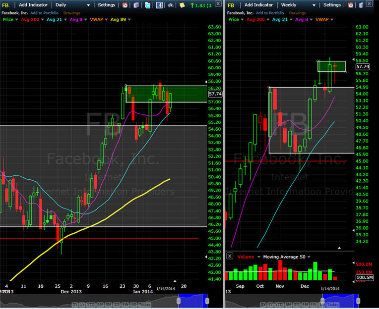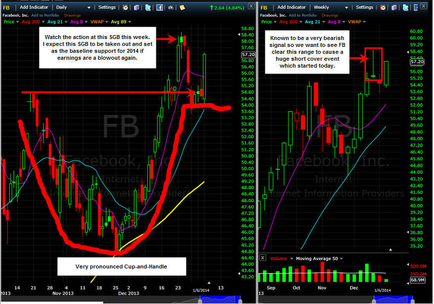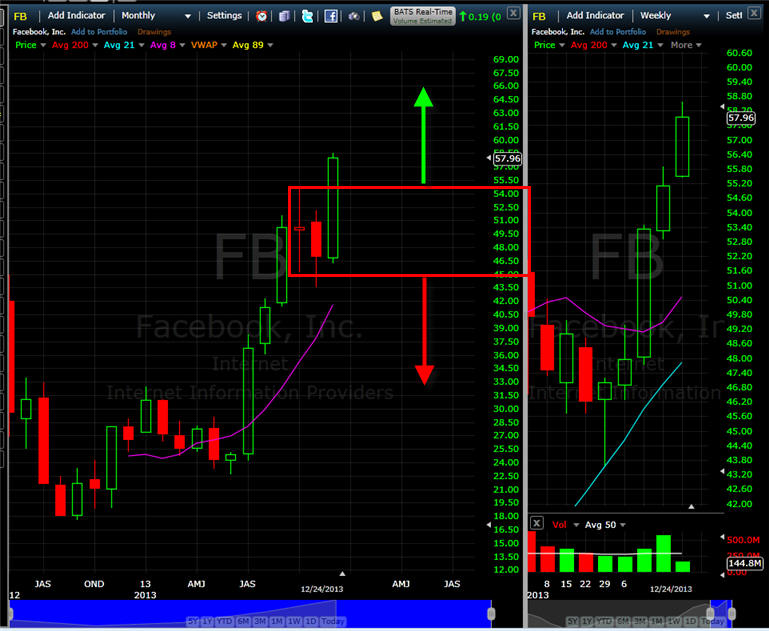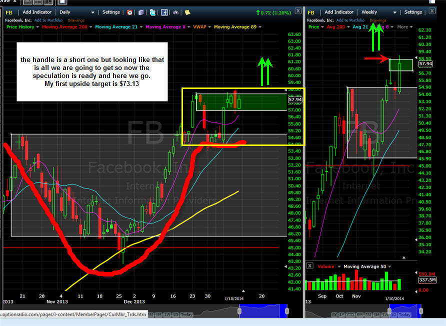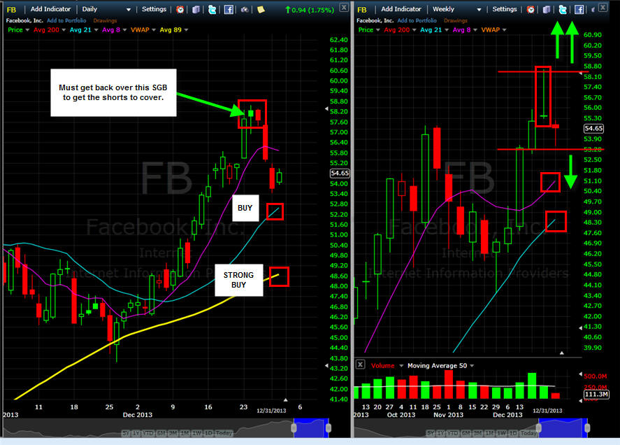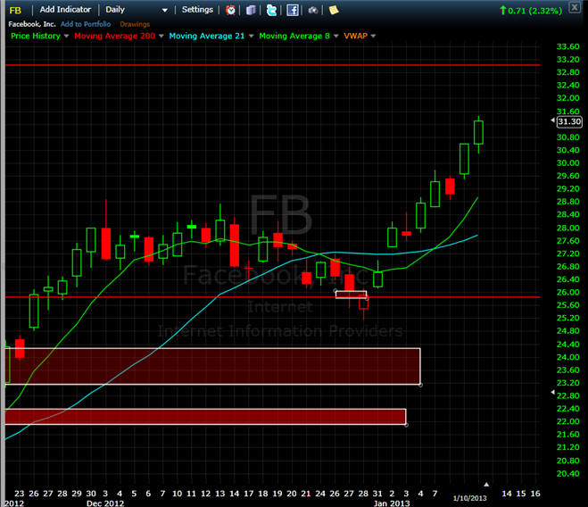 ================================================================================================= 1/6/13 - It's time to put on your game face-book! Friday, FB tested its recent highs and closed above the last high's close which typically means higher prices are about to happen! I am optimistic these last round of upgrade accolades are going to actually play out because AAPL was dumped while FB was pumped! I am thinking big money is looking at FB as the next growth stock of 2013; and if they have a blowout quarter, then get ready to take a ride beyond the IPO price. Of course, if they miss, you better have PUTS in place because you are going to make a ton of money there too! As I have said in the past, FB is a buy and hold type investment so that means you get long stock or long LEAPS. We can trade weekly options around the volatility so get ready for a very profitable year trading FB!