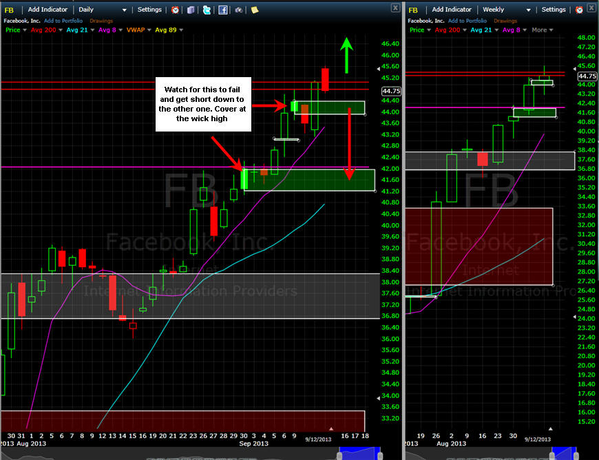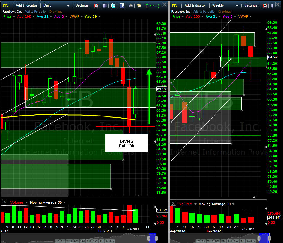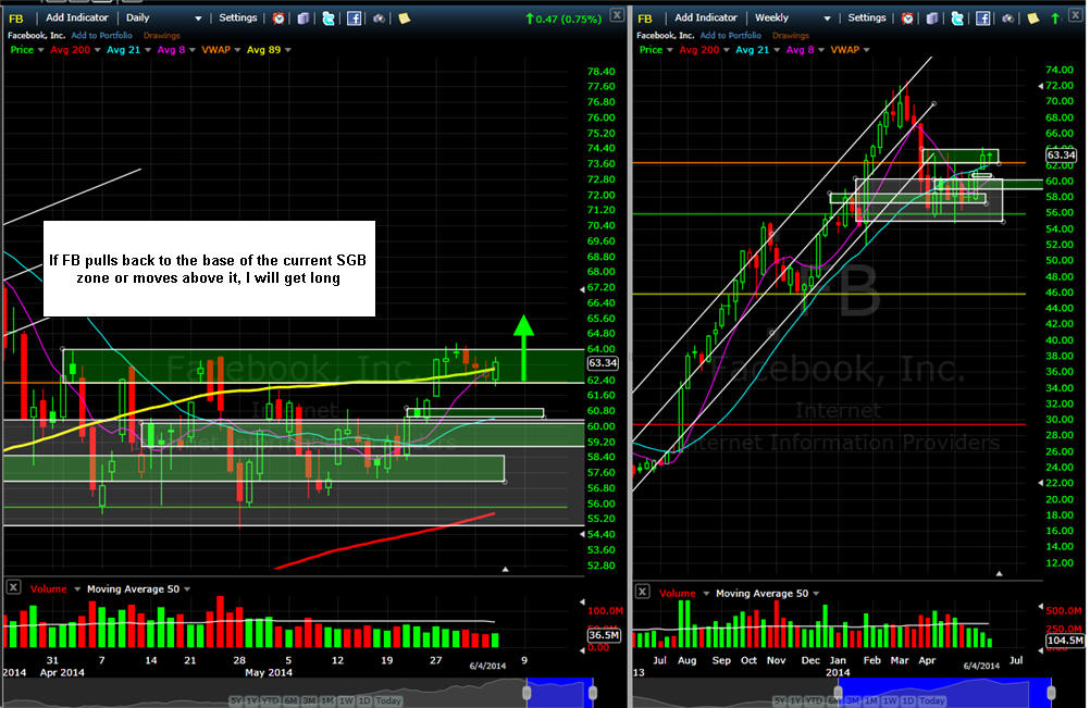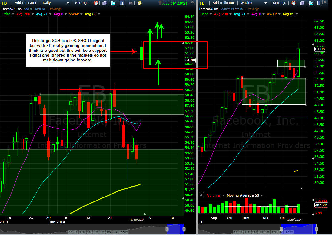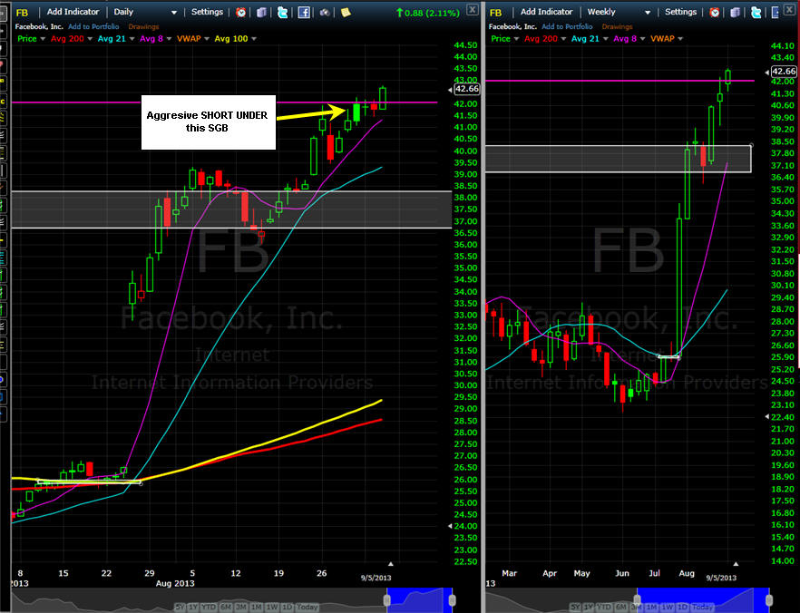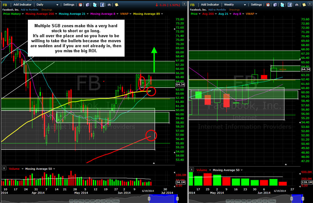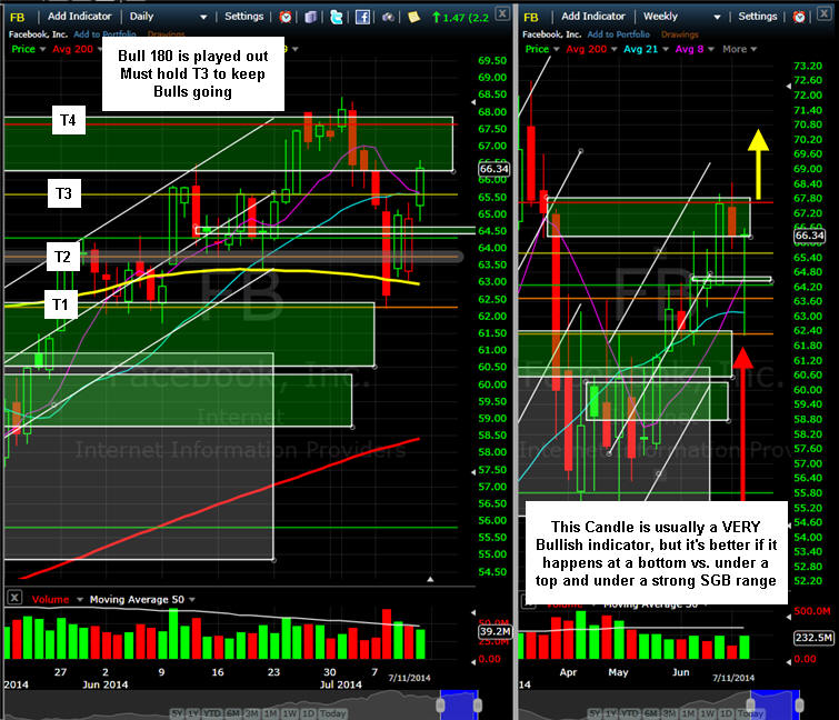 ==================================================================================================== 6/10/13 - A very nice day to be long FB. A couple of news stories and some very positive comments that FB is the buy of the century gave rise to this stock. Hmm, how is it that all these "savvy" analysts seem to come on CNBlahC and tout stocks are "great" buys or sells when things are massively oversold or overbought? How come they are not ahead of the action? I know I am and I put myself out there good or bad. Ok, so is this a pump and dump? Well, that depends on how FB handles the SGB on the weekly chart. Today's impressive rally was stopped dead with a close under so until FB can make that move over it on a close, then I would have a stop on any longs at today's low. I have been waiting for a Bull 180 that has failed once and now it's attempting to move higher gain. Notice how FB stopped dead at T2? Well, that means that SGB is pretty strong so any further rise should be to T3.