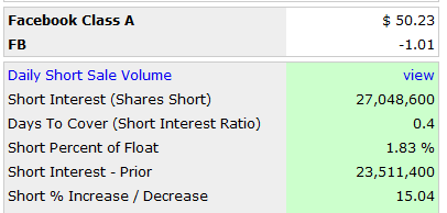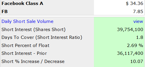 ==================================================================================== 4/30/13 - Earnings are tomorrow and FB is looking like it wants to make a move. Question is, what will that move be? If we look at the daily chart, we have two SGB events that have, so far, been ignored. This indicates FB has a lot of momentum behind it and if the earnings, particularly in mobile, are a blow out like the last two quarters, then we should see FB head higher...I am just cautions when there are SGB's involved. We also have a strong Bear 180 setup; however, the next red bar will be earnings based and most likely a big one. That means you would have to speculate by tomorrow if you were to short the stock. I am long shares for the long haul so I cannot get short stock. If FB fails then I will just manage with covered calls. Two day's ago FB was looking like it put in a Shooting Start Doji—which is a 90% SHORT. Today, the stock is attempting to attack the high of that wick. With the 89MA rolling over, there is plenty of resistance and that is what make for explosive moves if the stock surprises. Current short interest in FB is only: Since there is such a low short interest, it would have to be lifted higher (more than 10%) by institutional buyers which is usually done over longer time frames. The expected move so far is only $2.01 which is less than 10%. Ok, so what else can we look at for clues? Option Open Interest! It's looking like investors are placing bets on the calls at $28 so if you want to gamble on a "beat" then I would not go any further OTM then $31.00