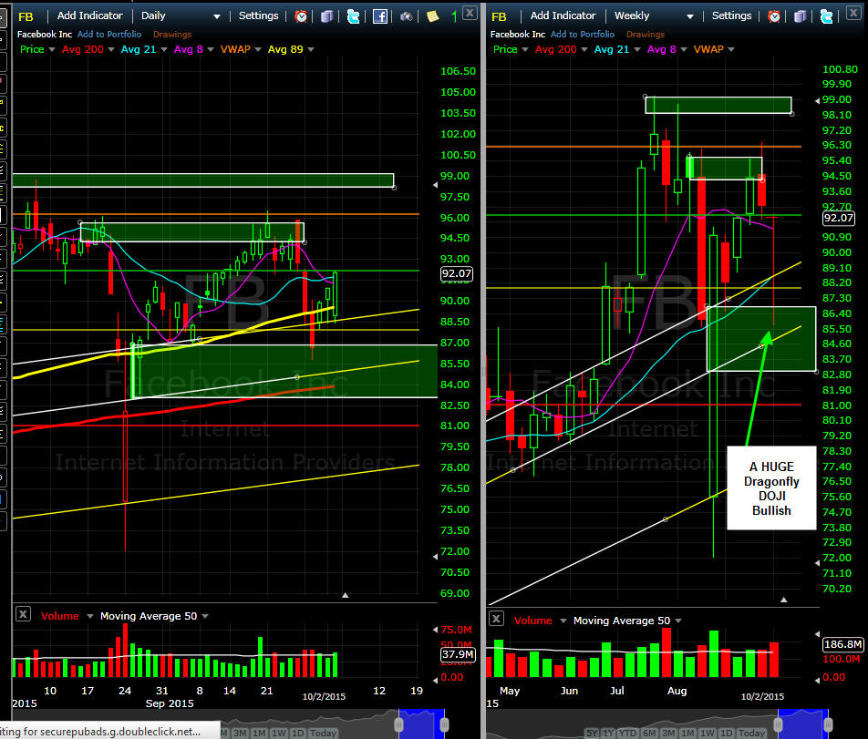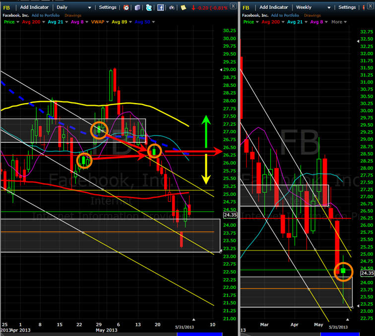 ======================================================================================= 5/30/13 - DANG! Upgrades today sparked a rally. Will it be a suckers rally? I am ALWAYS cautious when "upgrades" come out at the end of trading months. Especially when stocks are getting dumped like FB has been. I jumped on just like everyone else today, but I am cautiously optimistic. The weekly chart shows a very nice Dragonfly DOJI which is considered a very Bullish pattern when it happens at the bottom of a very large sell of. IF FB fails to move higher next week, then this DOJI will be a failure and the stock will quickly plummet under $20 in my estimation. The Bull 180 is in full swing with T2 taken out and now we look for T3 I was bummed we did not get one more drop so my 50 puts could have banked me a fat profit, but so it goes with any Lotto Ticket—you lose most until the winner lands in your lap!
