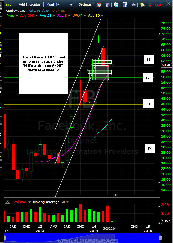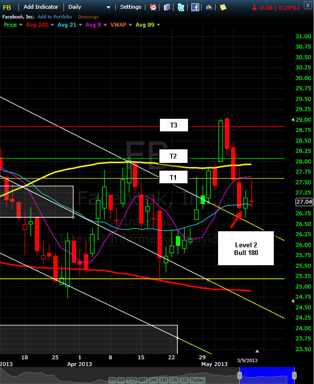 ========================================================================================= 5/15/13 - Not looking too good lately, but I am optimistic it will find some love soon. Right now, the money is going into GOOG, so when the market gets ready to take profits, FB will be a place to run the money into. The Bear 180 is still technically in tact and FB may get down to T3. The Bull 180 setup is now a Level 1 so I am just sticking with my long shares and Naked Puts for now until FB can get back over the SGB from 4/29/13.