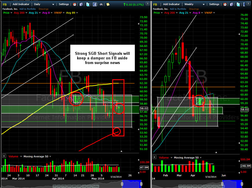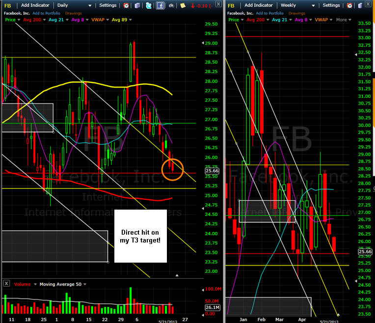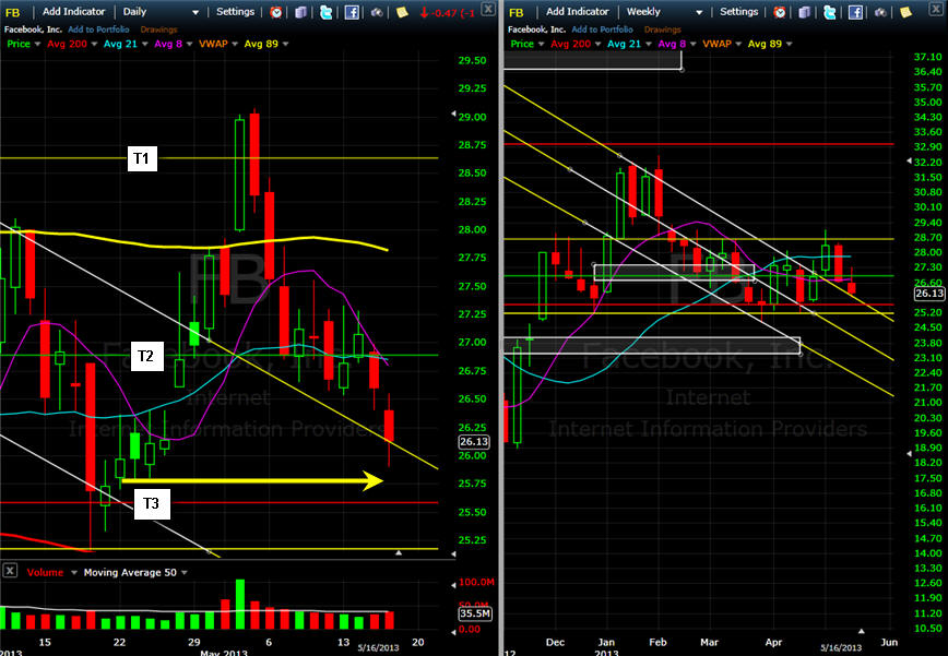 ========================================================================================= 5/21/13 - FB is touched down right on my T3 target. Will it make the bounce here or just keep on dropping? Well, with three SGB's showing, I am not getting a good feeling about any upside, but that can change in a day with any news because this stock is always on the potential run with future compelling news. I will stick with my naked puts and long shares for now.