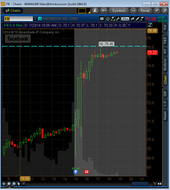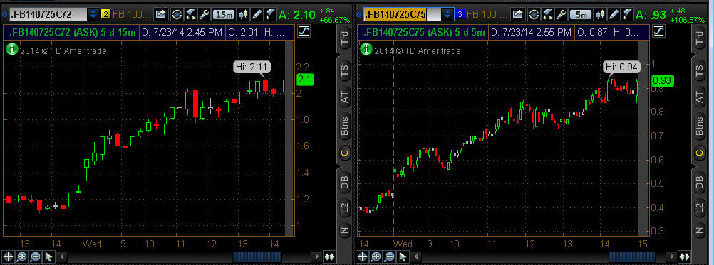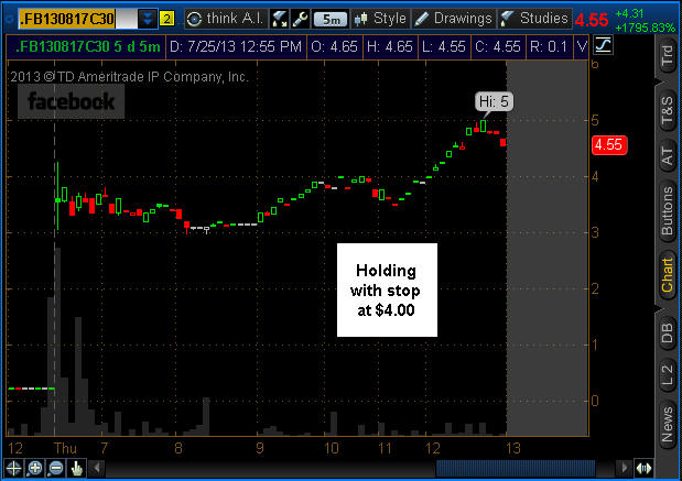 ================================================================================ 7/25/13 - BAM!!!!!!!!! Another Mega Lotto Ticket Cashed In!!!!! I am keeping the Aug13 30's with a stop and see if FB can continue higher. FB may take some profits tomorrow, but any dips will be met with BUYERS so do not get too greedy if you catch any WW puts. Note: I am fishing for AugWk1 on the WW Calls Here is what the LOTTO 30 Calls did today. Congrats if you were able to get in on this trade recommendation!!