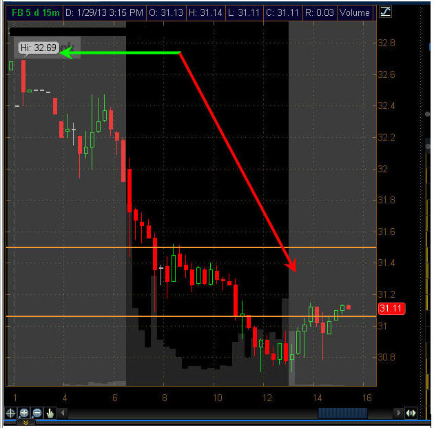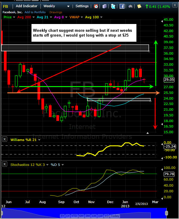======================================================================================= 2/11/13 - FB is losing momentum and looking to move lower. Long term there is a lot of potential especially with the massive move of LNKD last week. It's going to take a couple of quarters for FB to find itself in the minds of fund managers, so until that happens we need to watch how the volume kicks in on rebounds from dips. I need FB to get moving down if my Lotto Puts are going to make me any money. The calls are definitely going to expire worthless ;-( With the after hours downgrade of FB to a price target of $27.00? Hmm, seems fishy to me but the stock is trading lower in post market so I will gladly take it in stride and hope this gets some momentum behind it tomorrow and drops the stock below $27.00 There will be plenty of trading opportunities with this stock future!