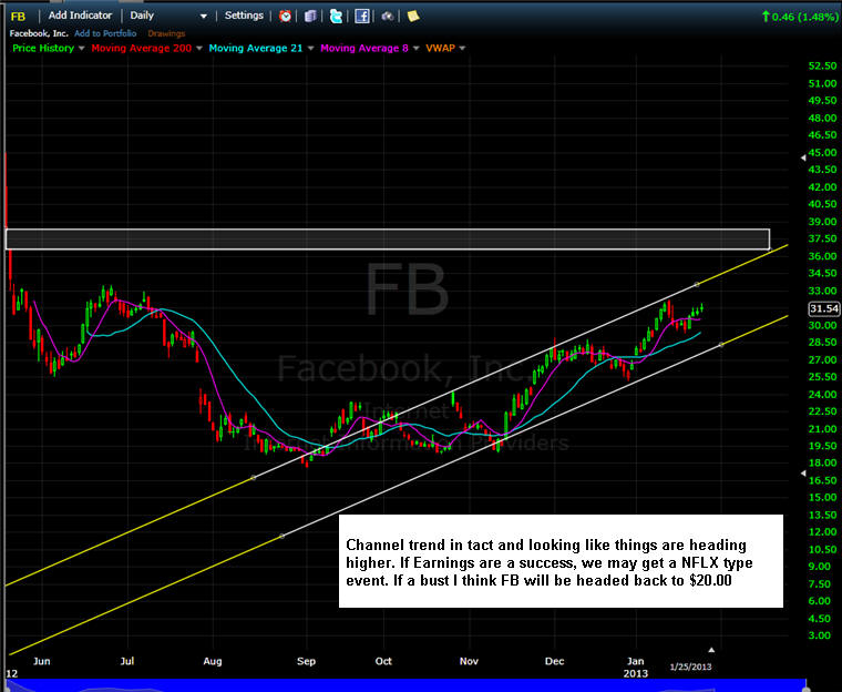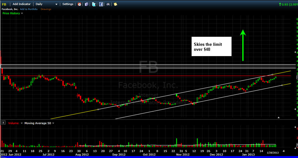 =========================================================================================== 1/28/13 - The race is on and FB is roaring up to resistance from Jun 2012 at $33.45. If they blow out expectations and make an unexpected announcement, we could very well see this stock move 20% or more like NFLX did...maybe even blow right by the IPO high at $45.00! Now that would make for one heck of an options LOTTO trade. I am building a long position for the future as well as speculation on the Weekly options. Of course if they disappoint, then you know this stock will be dumped massively and head back to sub $20.00 so OTM puts are definitely on the table. I am overweighting calls and will pick up Feb13 puts as well as a couple of Weekly puts too. Today the stock moved higher and kept right on going in post market trading on strong daily volume. The FebWk1 options show strong volume at $30 - $34.00 and $36.00 on the calls and for the puts there are is a lot of action at $29.00 The Feb13 monthly options show heavy 60,000 contract volume on the 35 calls and strong open interest at the 30 puts Longer term, there is low volume so many investors are not that bullish on this stock a few months into the future and that makes for an opportunity. Of course if you by the 40's like I am, you are 100% gambling so you need to be ready to accept a 100% loss or just stay at $35 or lower—but hey, I am looking for the .10 cents to $40 returns!!!